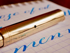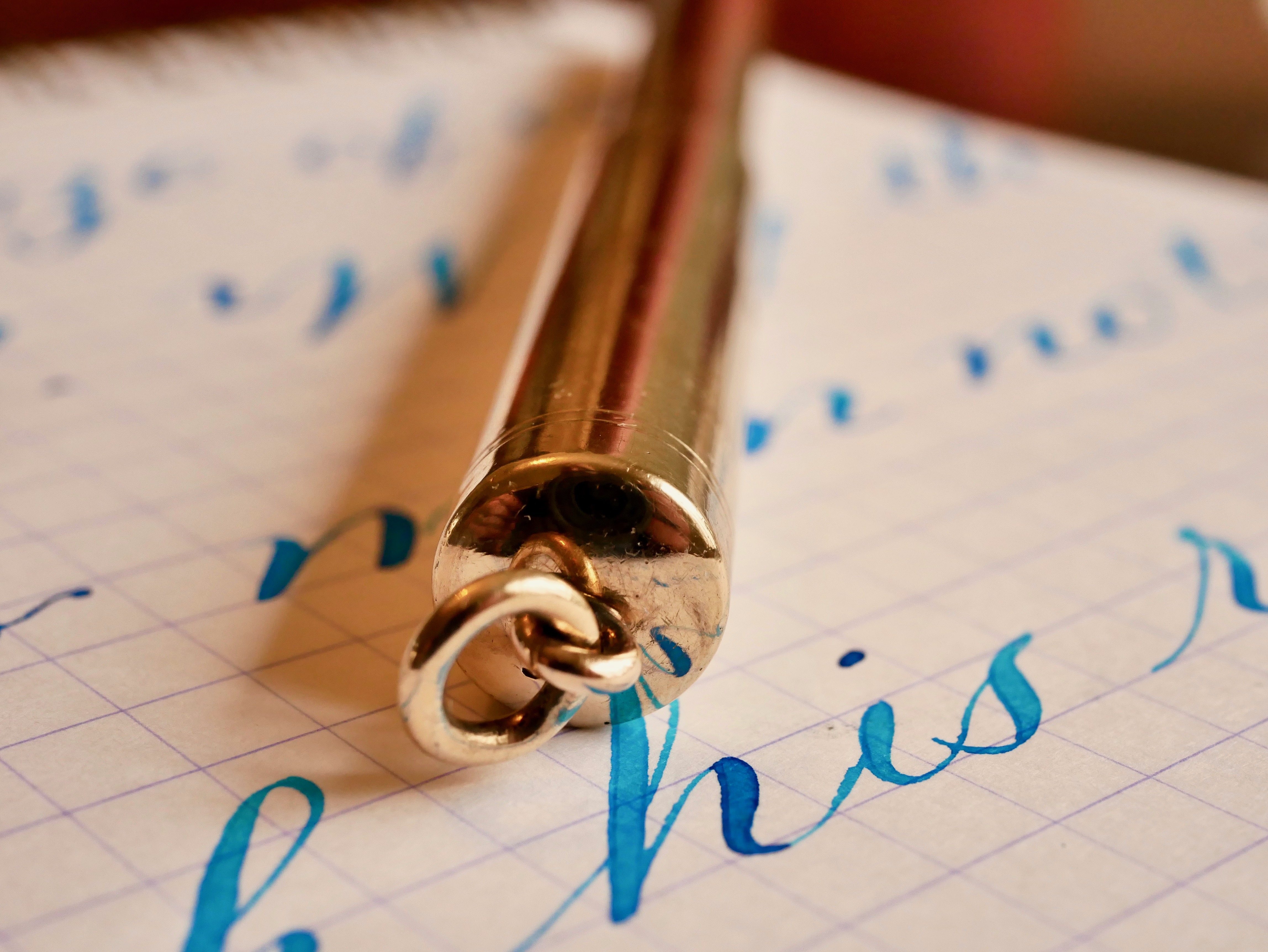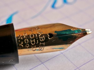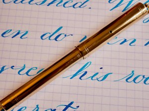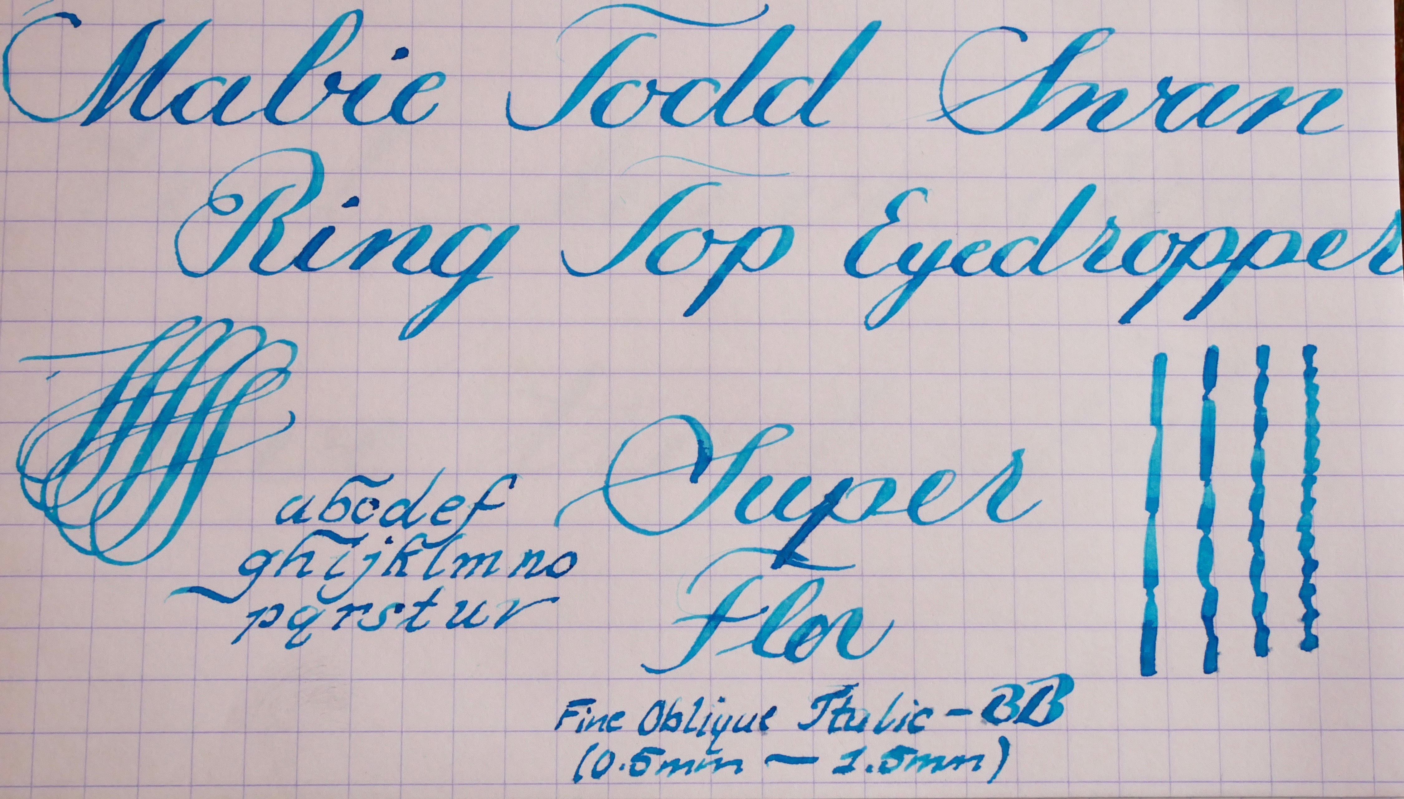 This is a very interesting made in New York Mabie Todd Swan. It’s gold-filled ring top that is also an eyedropper. It has some light scratching on the body but no brassing. There are also a few tiny dings. On the barrel and on the cap there are some very small imprints of symbols that I do not recognize and are not very noticeable. The 14kt. Mabie Todd Swan #2 is an unique Fine Oblique Italic (0.5mm). The oblique angle is pretty significant. That makes italic writing easier, but that also means it has a learning curve in using it. It is plenty wet and can be smooth if you hold at the right angle. The flex comes quite easy and ranges up to BB (1.5mm). The oblique italic tip enhances the already snappy flex and makes for a very unique writing experience. I quite enjoyed using it. You must learn to use it at the right angle or you’ll get railroading. Overall, it’s a great, and unique Swan.