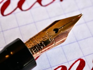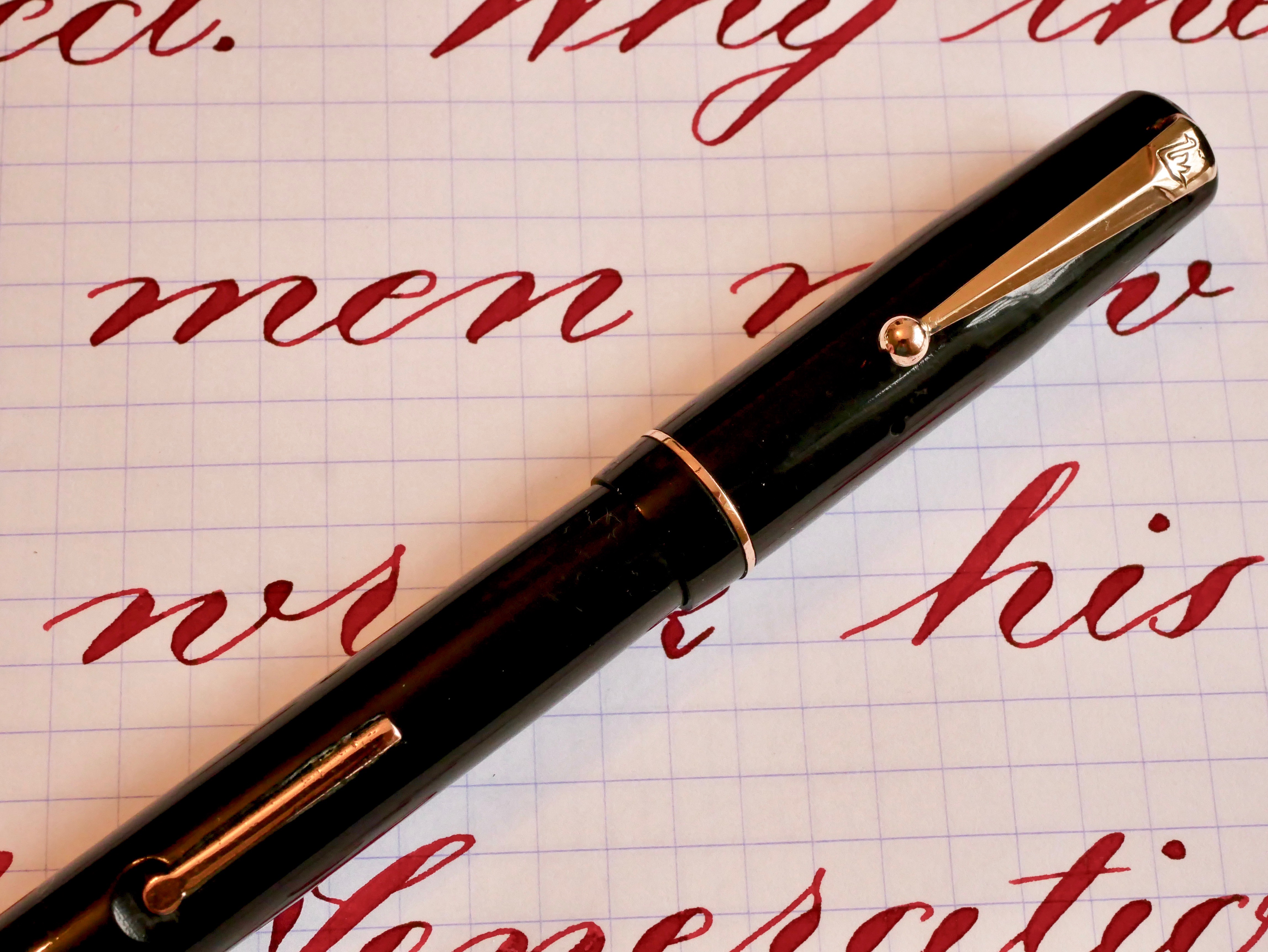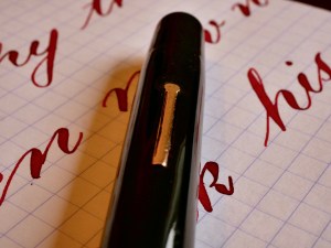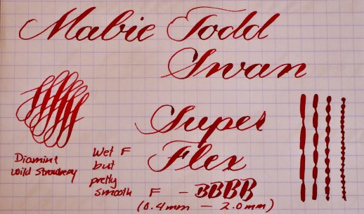 Here is a Mabie Todd Swan Self Filler. The body has some light teeth marks on both ends of the pen. The gold-filled clip and band are in good condition without brassing. The lever has some light pitting throughout. The 14kt. Swan #2 nib is a wet F (0.4mm) that is quite smooth. The flex range is huge going from F (0.4mm) to BBBB (2.0mm). Responsiveness is decent. Not amazing but good enough to do some nice flex work. Ink flow is great and has not trouble keeping up.