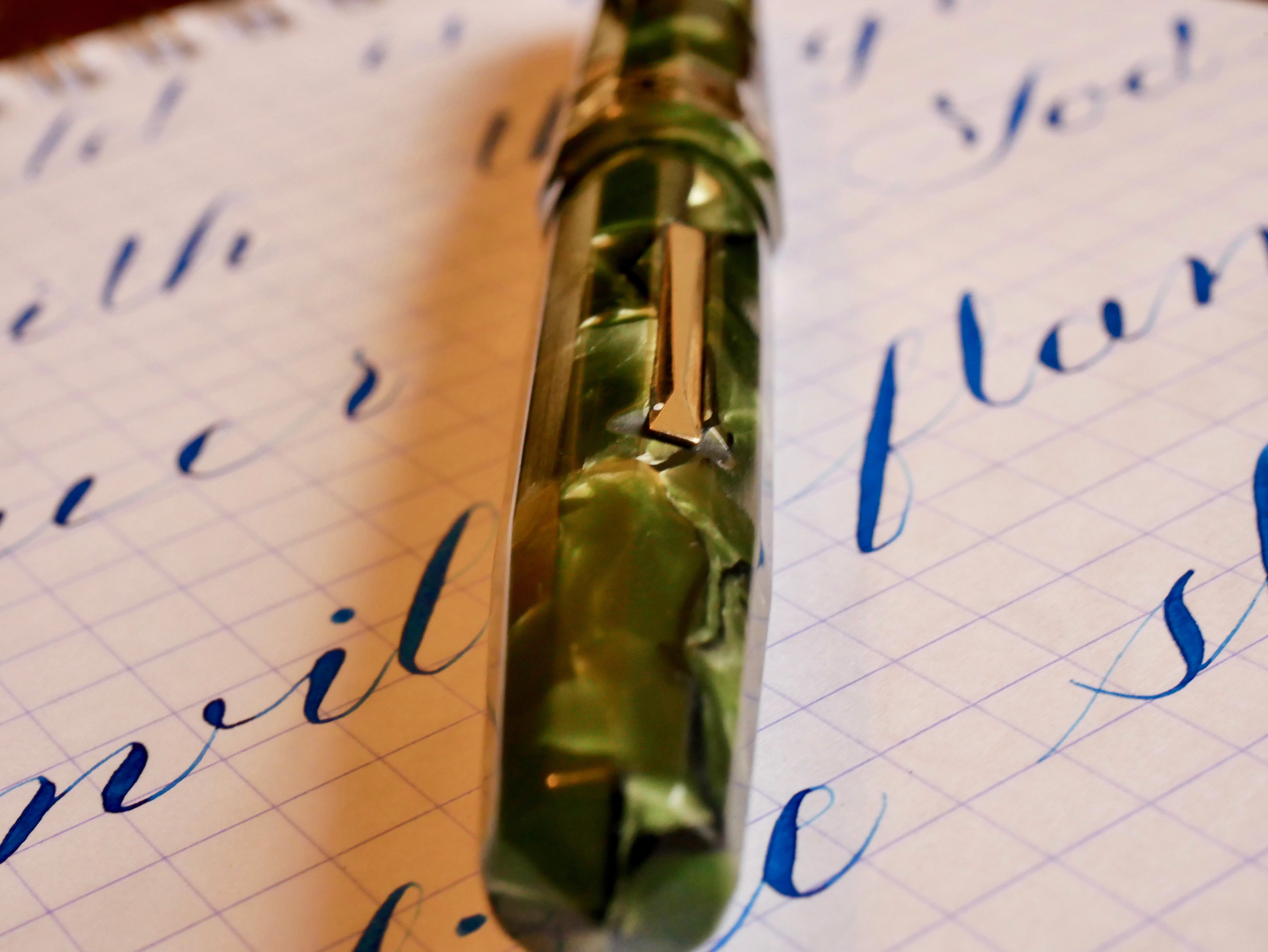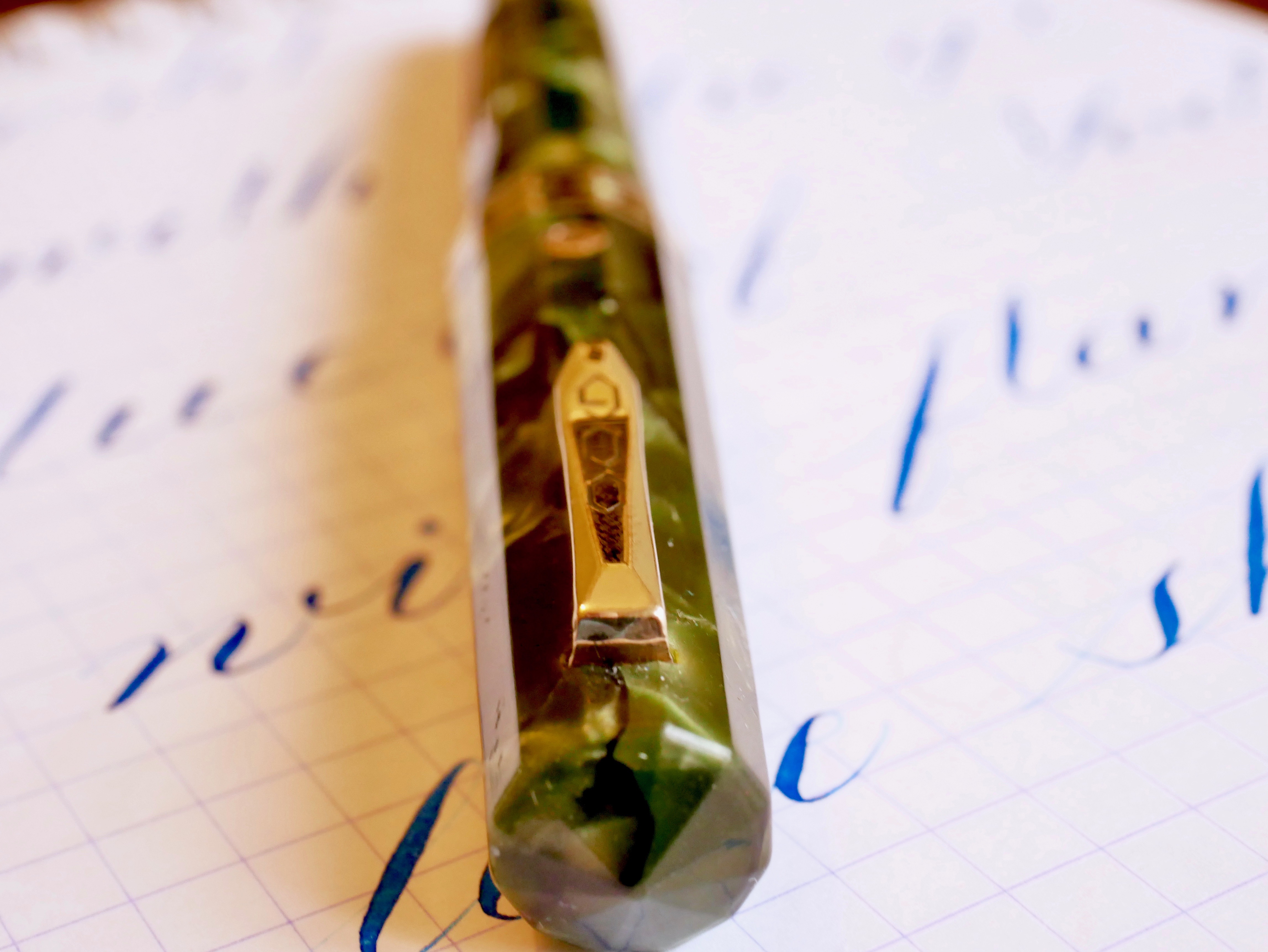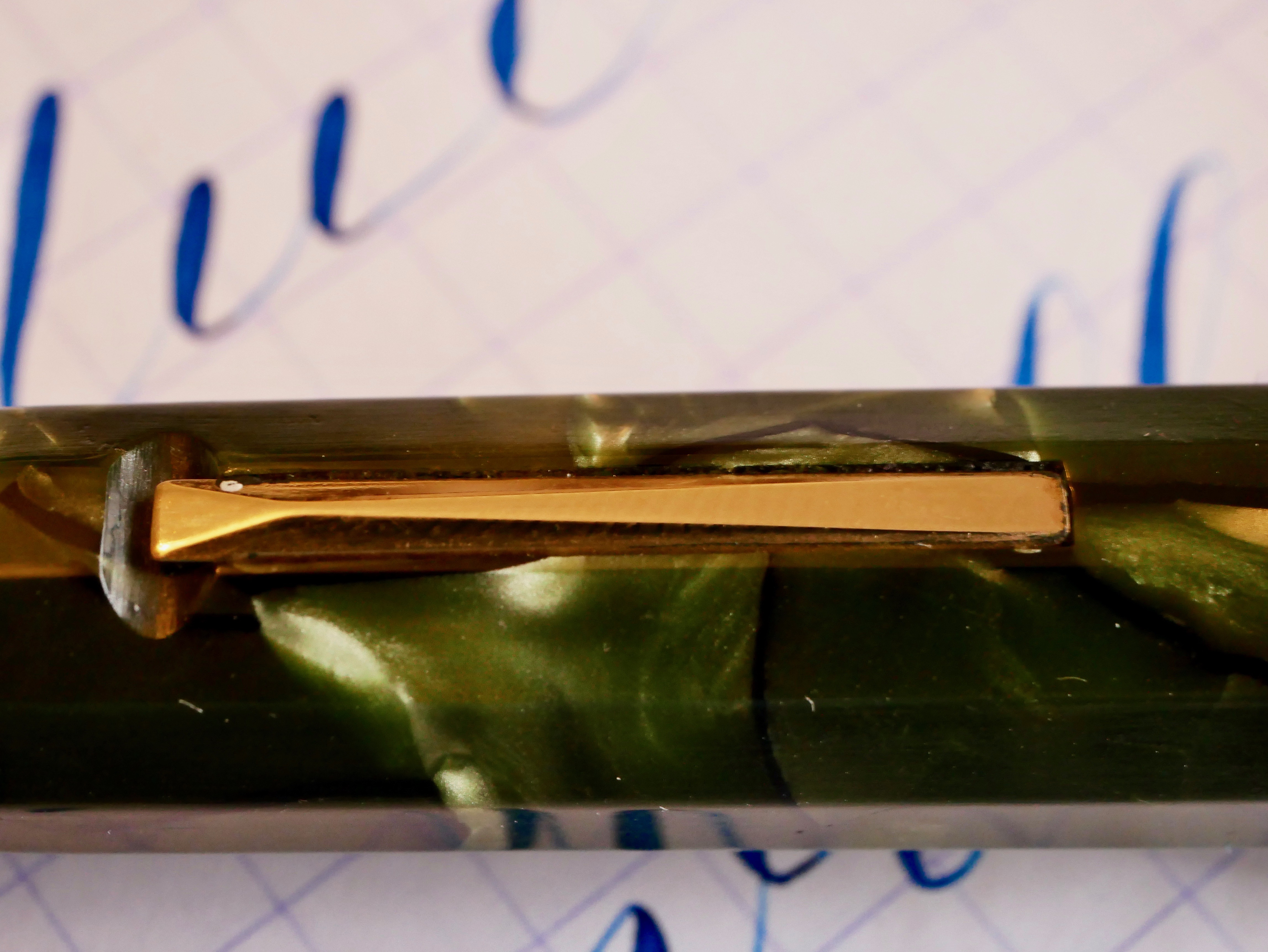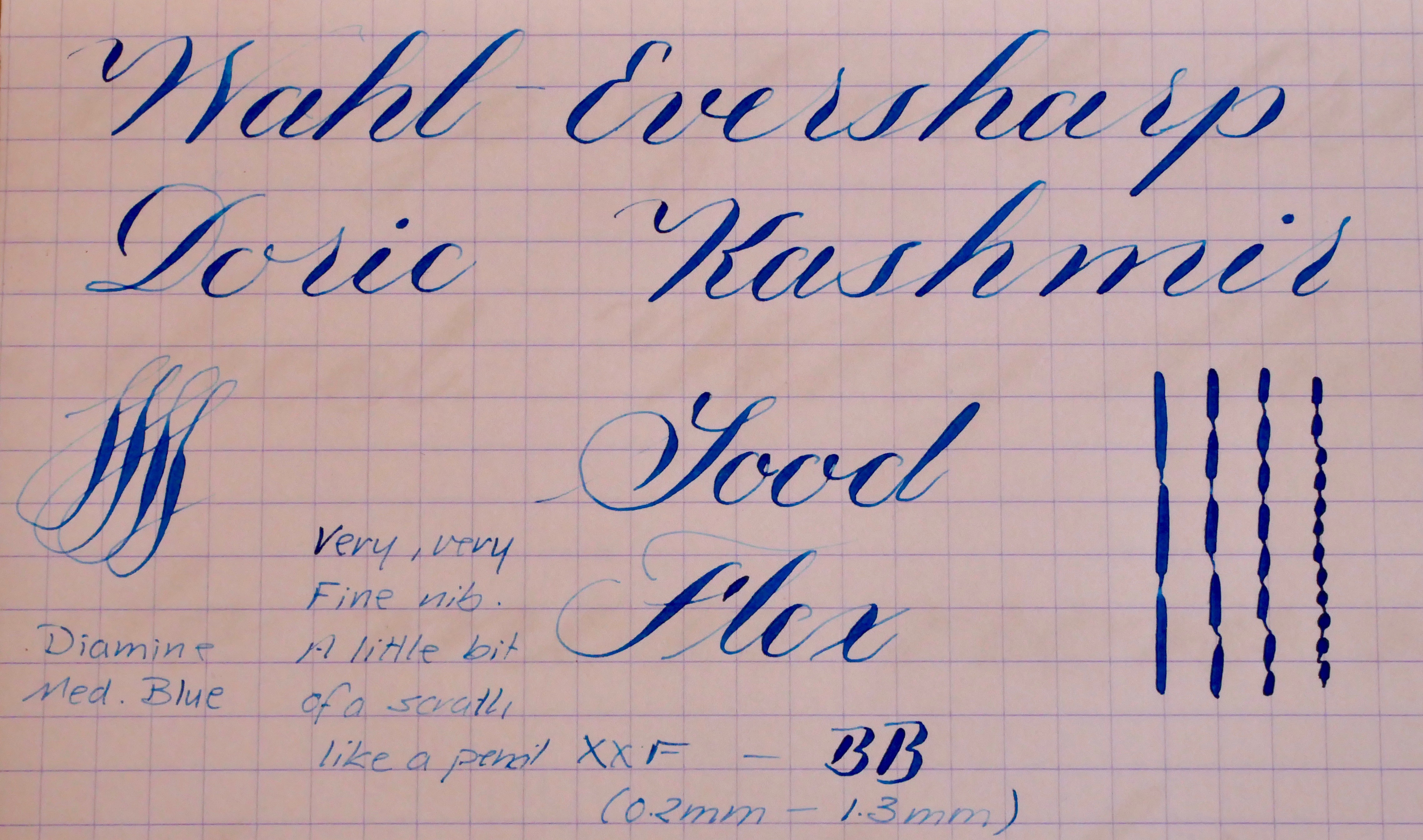 Here is Wahl-Eversharp Doric in Kashmir. The body is in great condition with only very light scratching on the body. The gold-filled clip, lever, and band are in great condition with no brassing. The 14kt. Eversharp Signature nib is a great nib. It’s a very fine XXF. Perhaps even a XXXF. It’s somewhere between 0.1 and 0.2mm. Normal writing has a bit of a scratch as would be expected from so fine a nib. The flex goes up to 1.3mm (BB). I’ve graded this a “good flex” because the flex range isn’t huge, but the extreme fineness of this nib makes this flex have a “super flex” like quality. Kashmir Dorics are hard to come by in such beautiful condition, and if you enjoy XXF nibs this is for you.