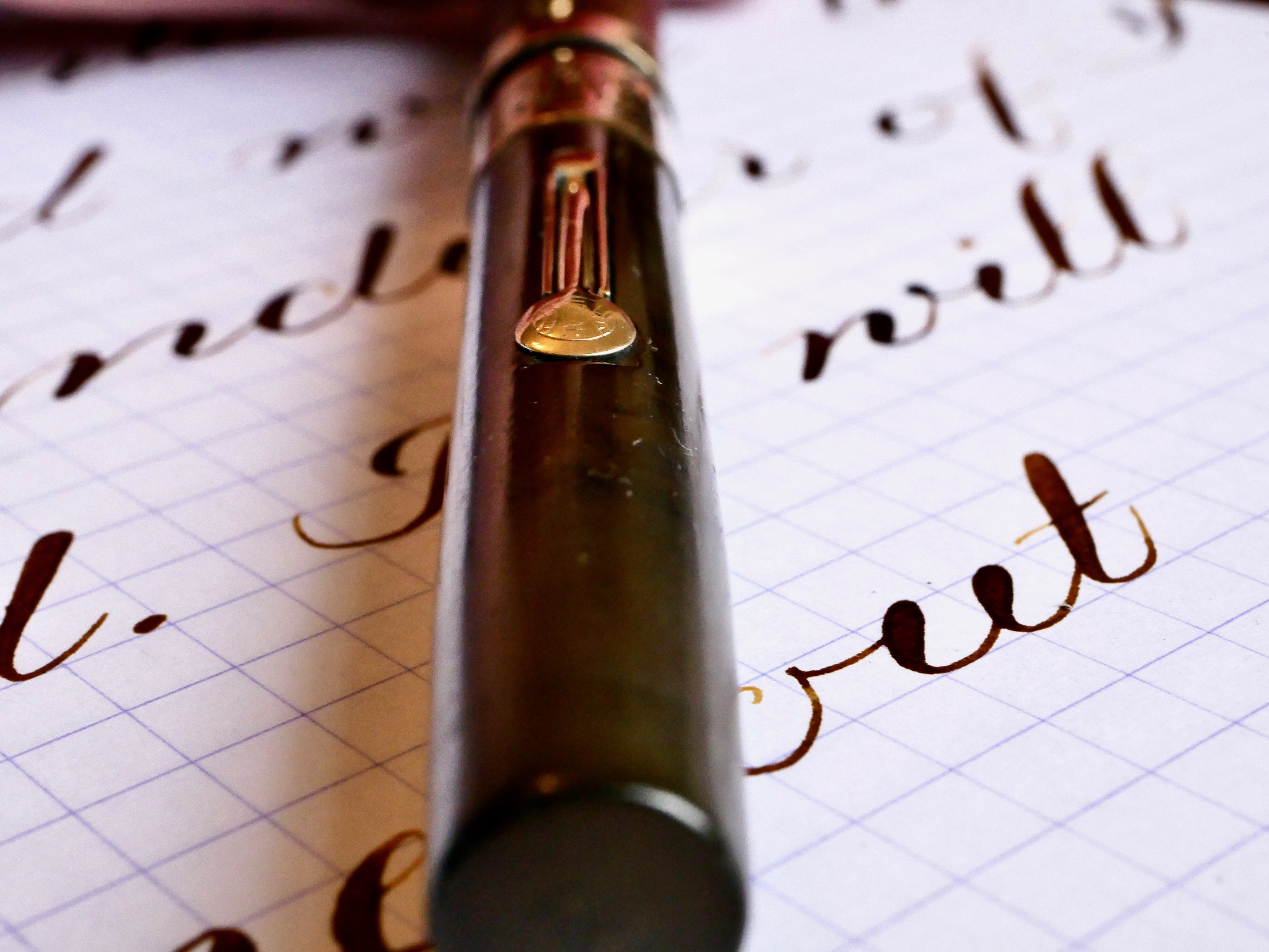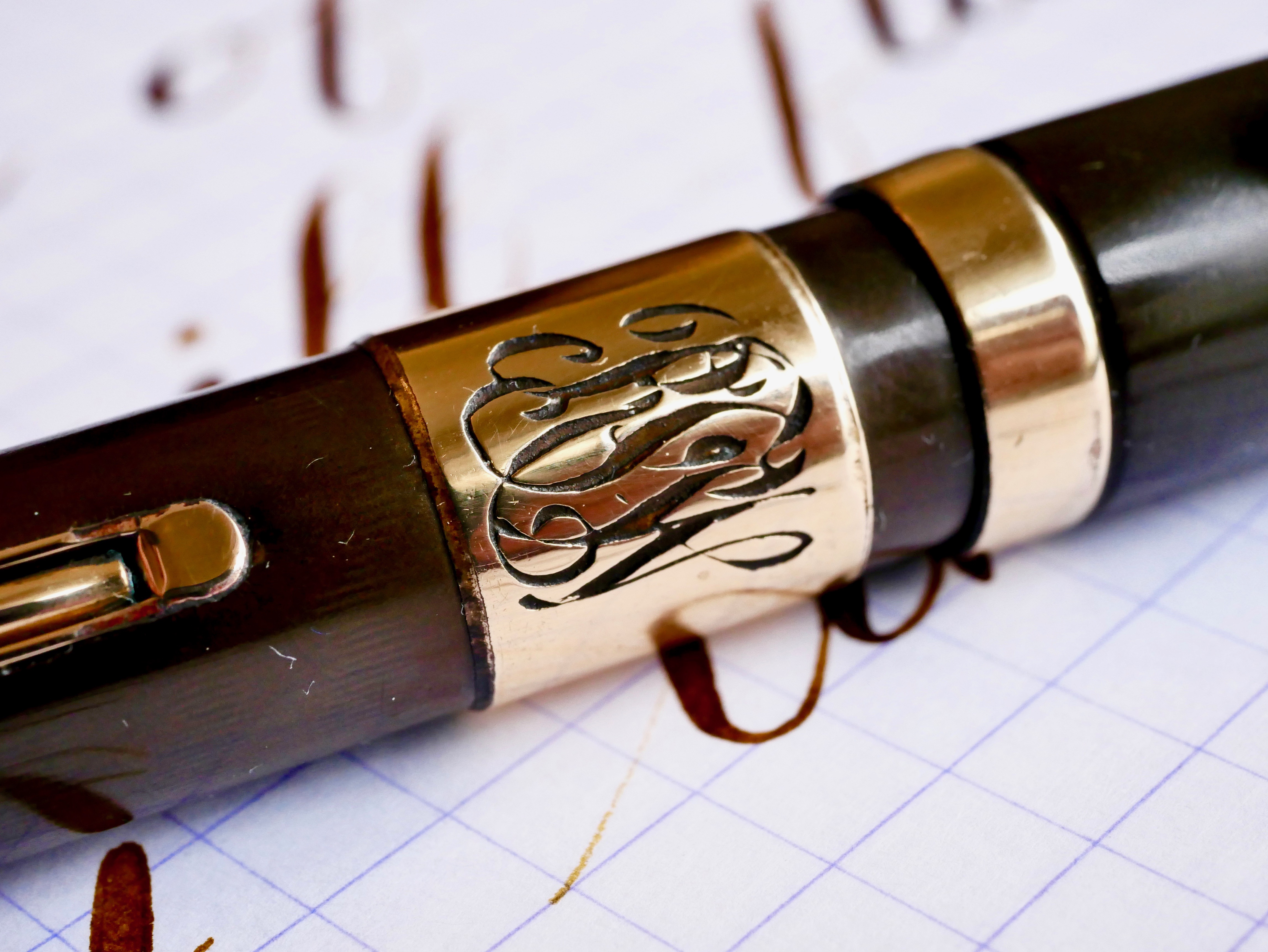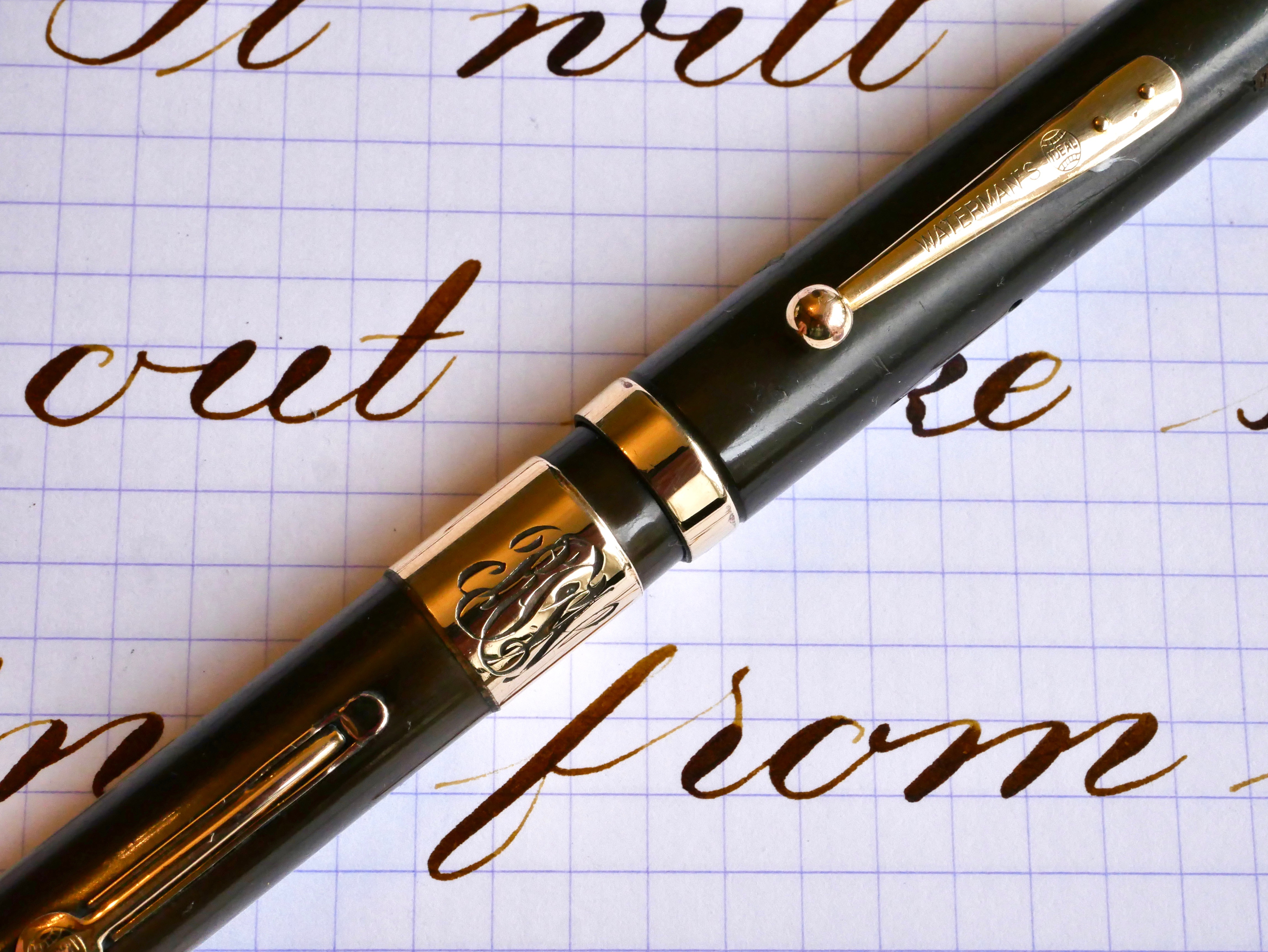 This is a great vintage Waterman 54 in BCHR. The chasing on this pen is worn smooth. In fact, the chasing pattern is even hard to see and the only imprint visible is the “54.” The color has faded to a dark brown. There is a large and beautiful gold-filled band on the barrel with some initials engraved in script. There is a bit of wear on the band, but it still looks quite good. There is a little bit of brassing on the top edge of the cap band and a little bit on the edges of the lever; otherwise, the trim is in good condition. Unfortunately, there is what looks like a small burn mark on the top of the barrel. The 14kt. Waterman #4 is a great nib that writes as a soft, smooth XF (0.3mm) and has medium wetness. Great writer. It has some nice and quite responsive flex going up to BBB+ (1.8mm). You can do some nice flex work with this one.