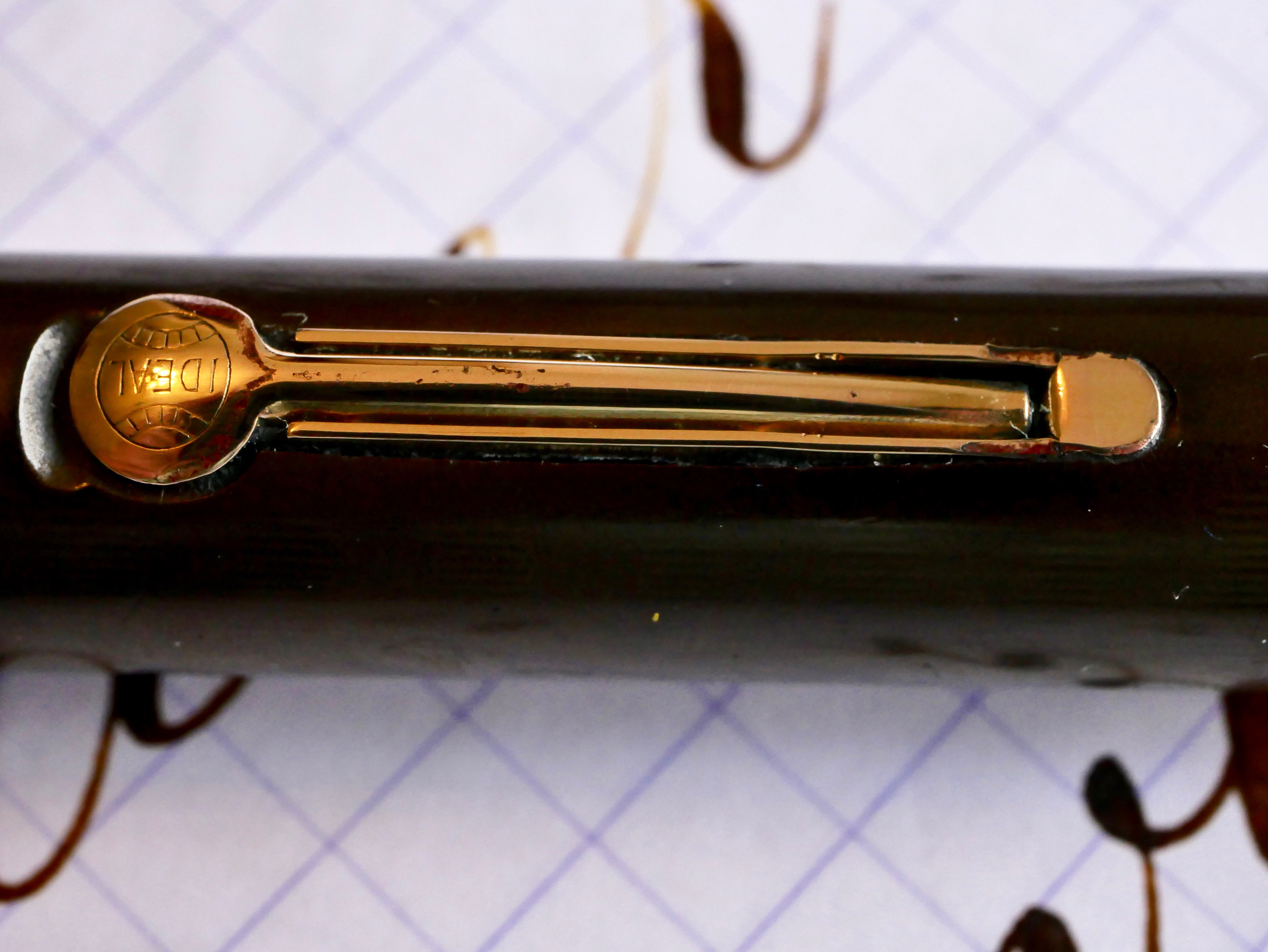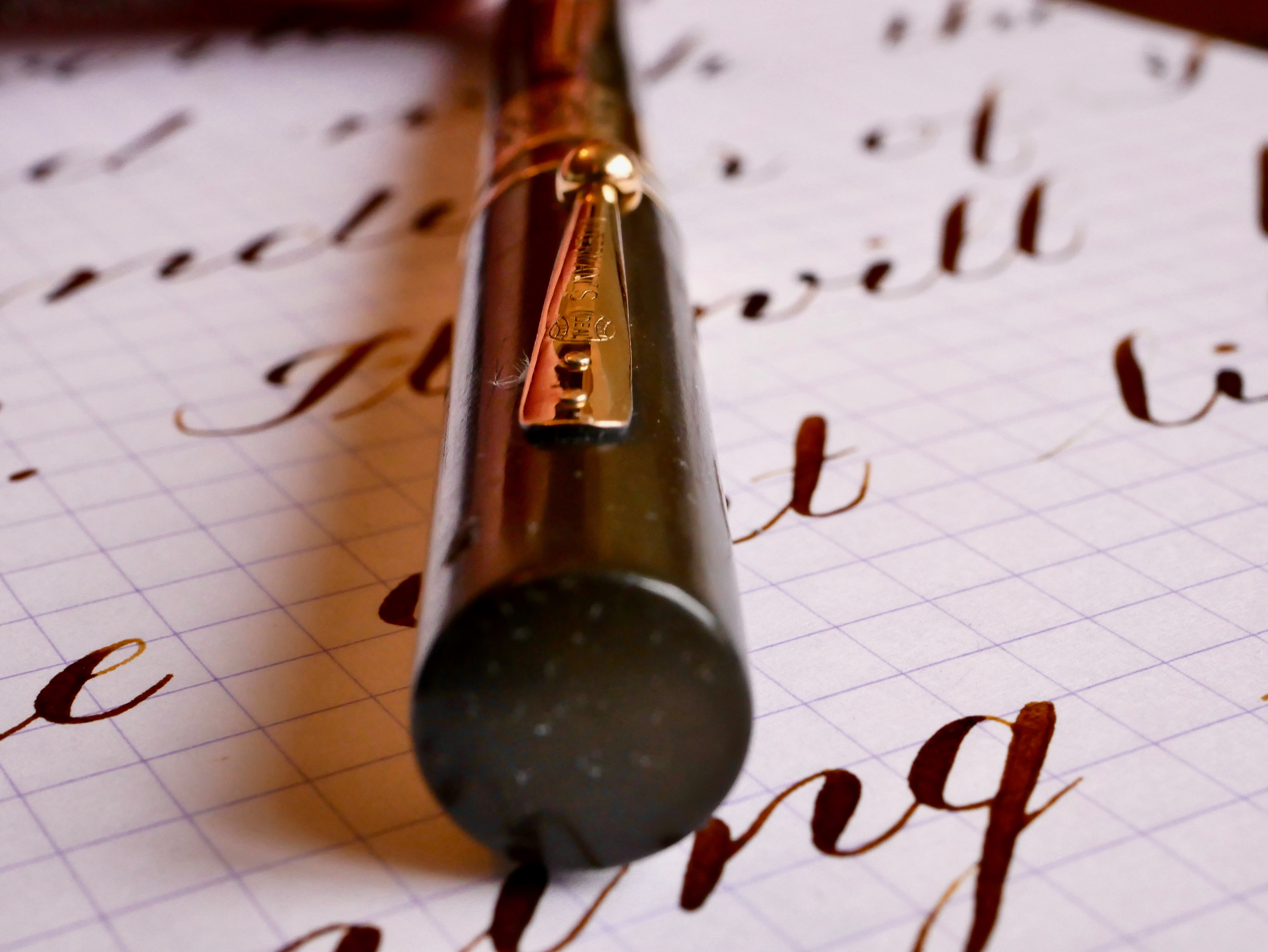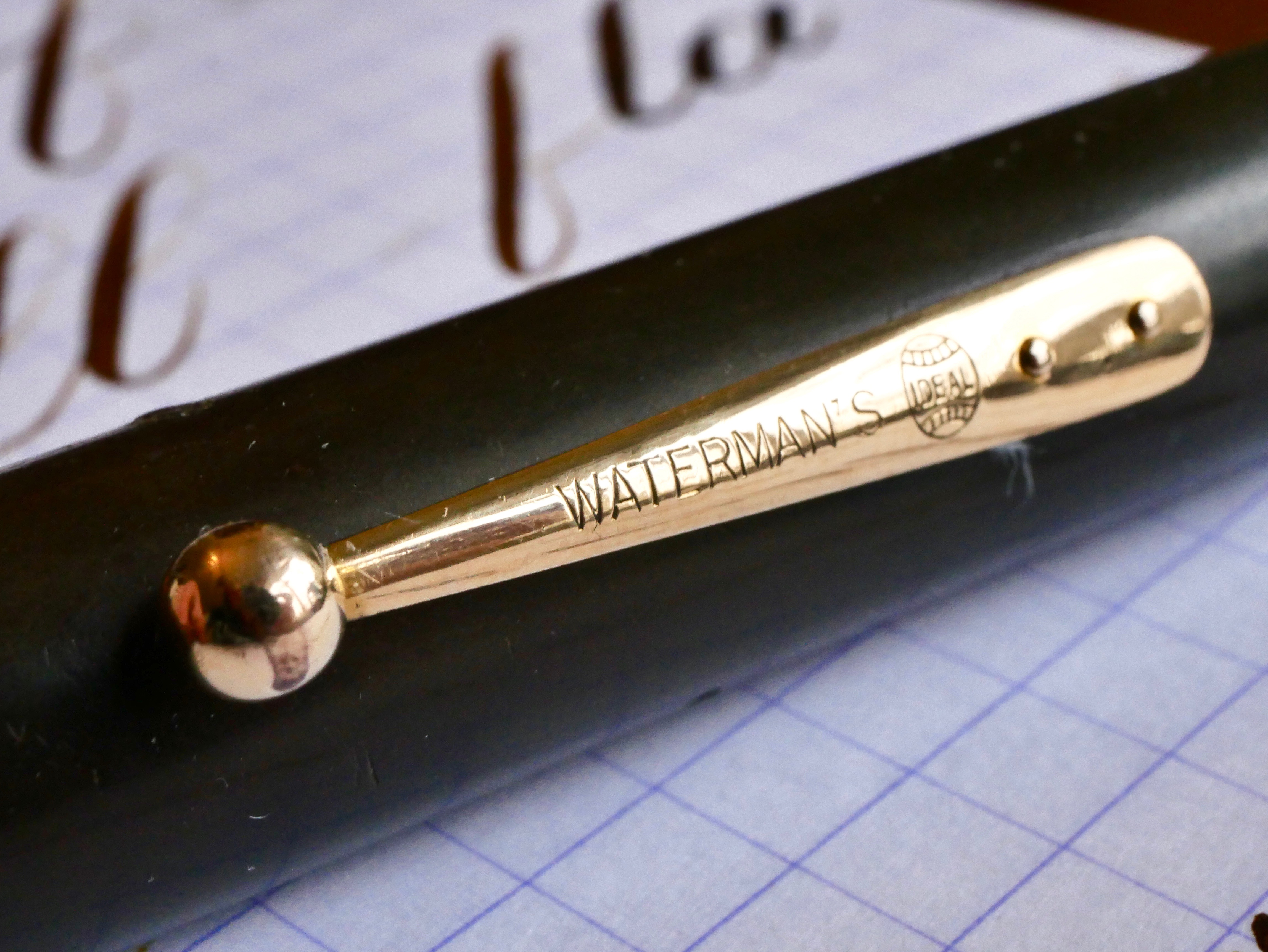 This is a great vintage Waterman 54 in BCHR. The chasing on this pen is worn smooth. In fact, the chasing pattern is even hard to see and the only imprint visible is the “54.” The color has faded to a dark brown. There is a large and beautiful gold-filled band on the barrel with some initials engraved in script. There is a bit of wear on the band, but it still looks quite good. There is a little bit of brassing on the top edge of the cap band and a little bit on the edges of the lever; otherwise, the trim is in good condition. Unfortunately, there is what looks like a small burn mark on the top of the barrel. The 14kt. Waterman #4 is a great nib that writes as a soft, smooth XF (0.3mm) and has medium wetness. Great writer. It has some nice and quite responsive flex going up to BBB+ (1.8mm). You can do some nice flex work with this one.