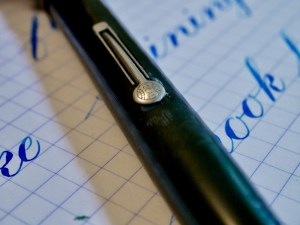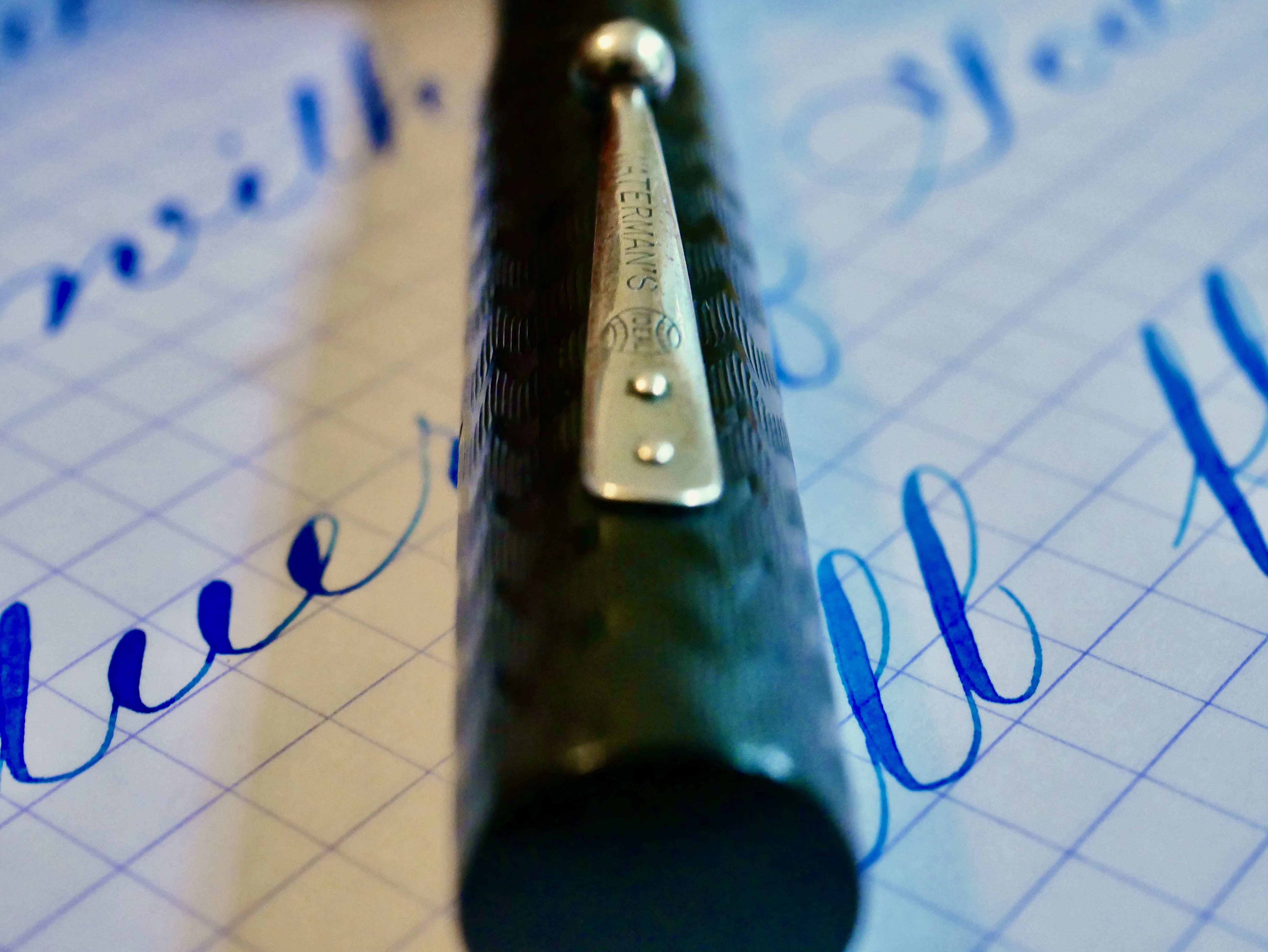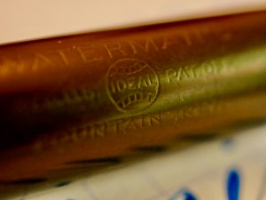 Here is a great Waterman 52 in BCHR with nickel trim. The pen is in pretty good condition overall. The hard rubber has faded to a dark, brownish, grayish black. The chasing is faded some on the body (more so than the cap), though there is still some texture to it but not much. Plenty of texture still on the cap. There is some wear on the clip but only brassing on the very bottom of the ball. The lever has some wear on the edges of the box but no brassing. The imprints are worn but readable. The 14kt. Waterman #2 is a surprisingly smooth XXF. It does not have the feedback you expect from such a fine nib, though there is still a small amount due to its fineness. The flex comes pretty easily and has a good range going from 0.2mm to 1.5mm (BB). The responsiveness of this nib is really outstanding making for some really nice, controlled flexing. Overall…it’s a 52 in good condition with a great nib. That’s about all you can ask for.