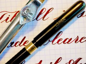 This is a made in England Mabie Todd Swan eye dropper with an ebonite over/ under feed and comes with a “Swan” metal pocket sleeve. The pocket sleeves allowed one the ability to bring along their eye dropper without having to worry about the cap slipping off. The slip cap on this pen is for a 1500 while the body is a model 1610, so this is not the original cap. I believe it is the correct size, but I think the 1500 model does not have the double bands. An unchased cap on a chased body is normal for Swans, so it is very close to what the original cap would have looked like. In any case, the body is in great shape. It has great black color and the chasing is remarkable crisp. Imprints have a little wear on the barrel, but are still easily readable. The cap does have some fading to a dark blackish brown towards the top. The gold-filled bands look great for their hundred years of life. The feed on this is ridiculously wet. I actually had to modify the fitting of the feed to slow things down, but it is still laying down a lot of ink. Normally, the #2 Swan nib writes as a super juicy and smooth Medium (0.6mm). The flex on this isn’t at the paintbrush level, but it is still easy to flex and with such a heavy flow a little flex gets big in a hurry. Range of flex is excellent going up to BBBB (2.0mm). Surprisingly, this pen has some pretty nice responsiveness for how abundantly the ink flows. If you want a pen to maximize sheen, this will do it.