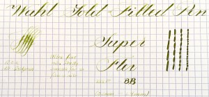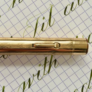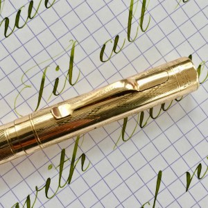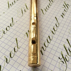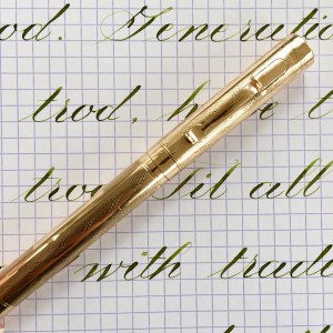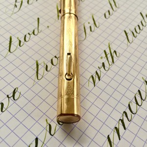 Here is a made in England Mabie Todd Swan Self-Filler in smooth (no original chasing) black hard rubber with a red-rippled hard rubber “crown” on the cap. This pen is nearly identical in size to a Waterman 52. The hard rubber has faded some to a blackish brown. The imprints are faded without a lot of texture, but they are mostly readable in good light. The gold-filled trim on the cap is in good condition with little if any brassing. There is some brassing on the bands of the body and on the edges of the lever. The 14kt. Swan #2 is a wonderful writing XF that has good flow without being a gusher. The nib feels soft and elegant. It also has some very nice flex ranging up to BBBB (1.8mm), though I usually keep it around 1.6mm. Responsiveness is also quite good and springy.