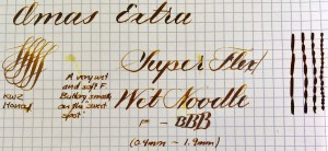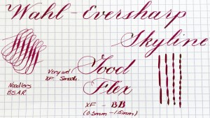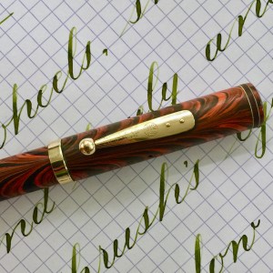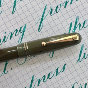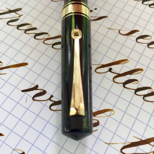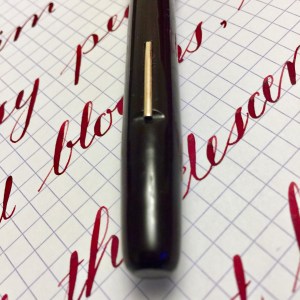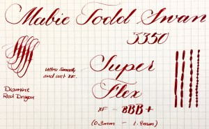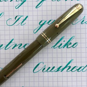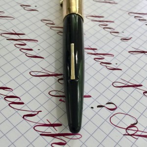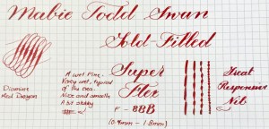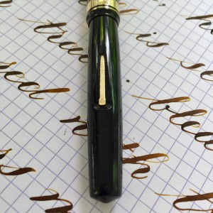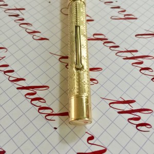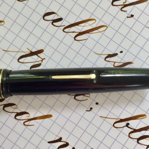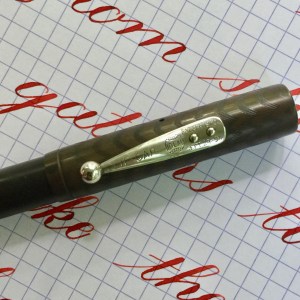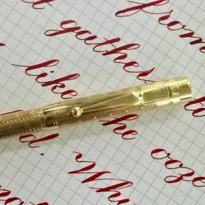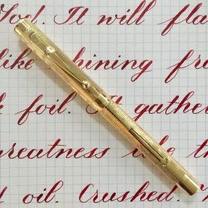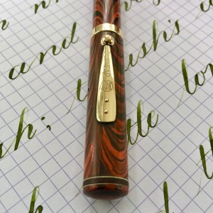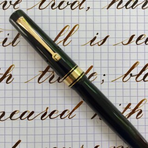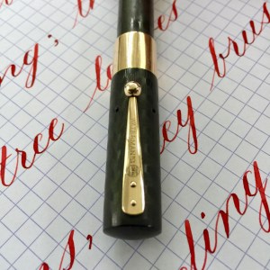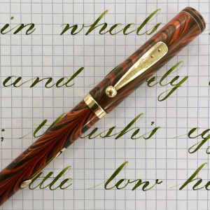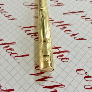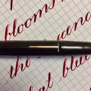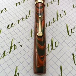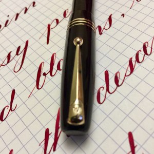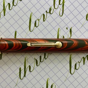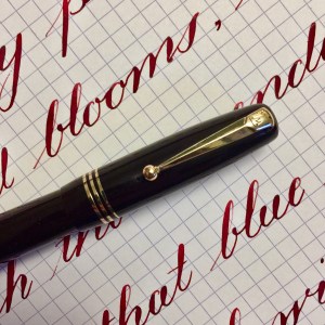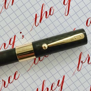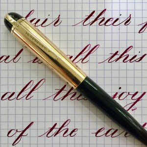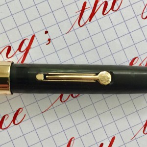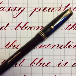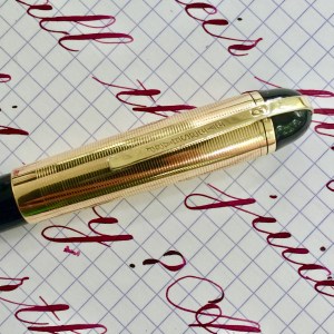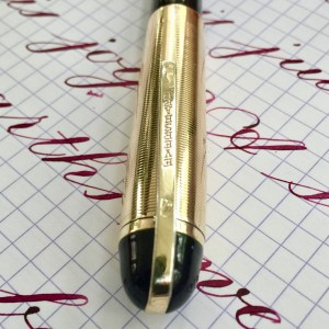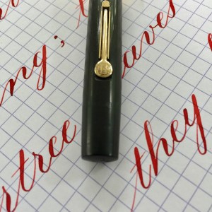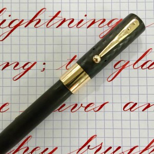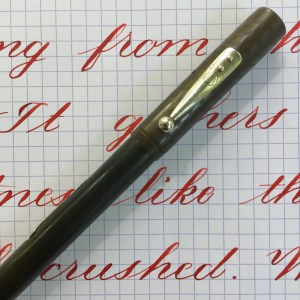 Here is a beautiful Waterman 5 Red Ripples with “RED” nib and “RED”. The 5’s of this period are about the same size as a 52. Slightly shorter with a slight wider barrel. The red ripple body is a little faded, though still pretty good color. The end of the barrel where the cap has been posted actually still has the original color. The gold-filled trim is still in excellent condition with no brasssing. The “RED” ring on the cap looks to be a replacement as the original would be darkened and faded. The #5 Waterman “RED” nib is a lovely writing F. It’s wet but not overly so and a bit stubbish. It’s smooth with just a hint of feedback. The flex is nice though most would expect a bit more out of “RED” nib. Despite popular belief the colored coded nibs are hardly uniform. The flex range goes from F – BBB (0.4mm — 1.6mm). Flow is good, ease of flex is a bit on the stiffer side of “super flex.” Still plenty good enough to do some nice work. Overall, it’s still one of the great iconic Waterman pens.