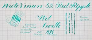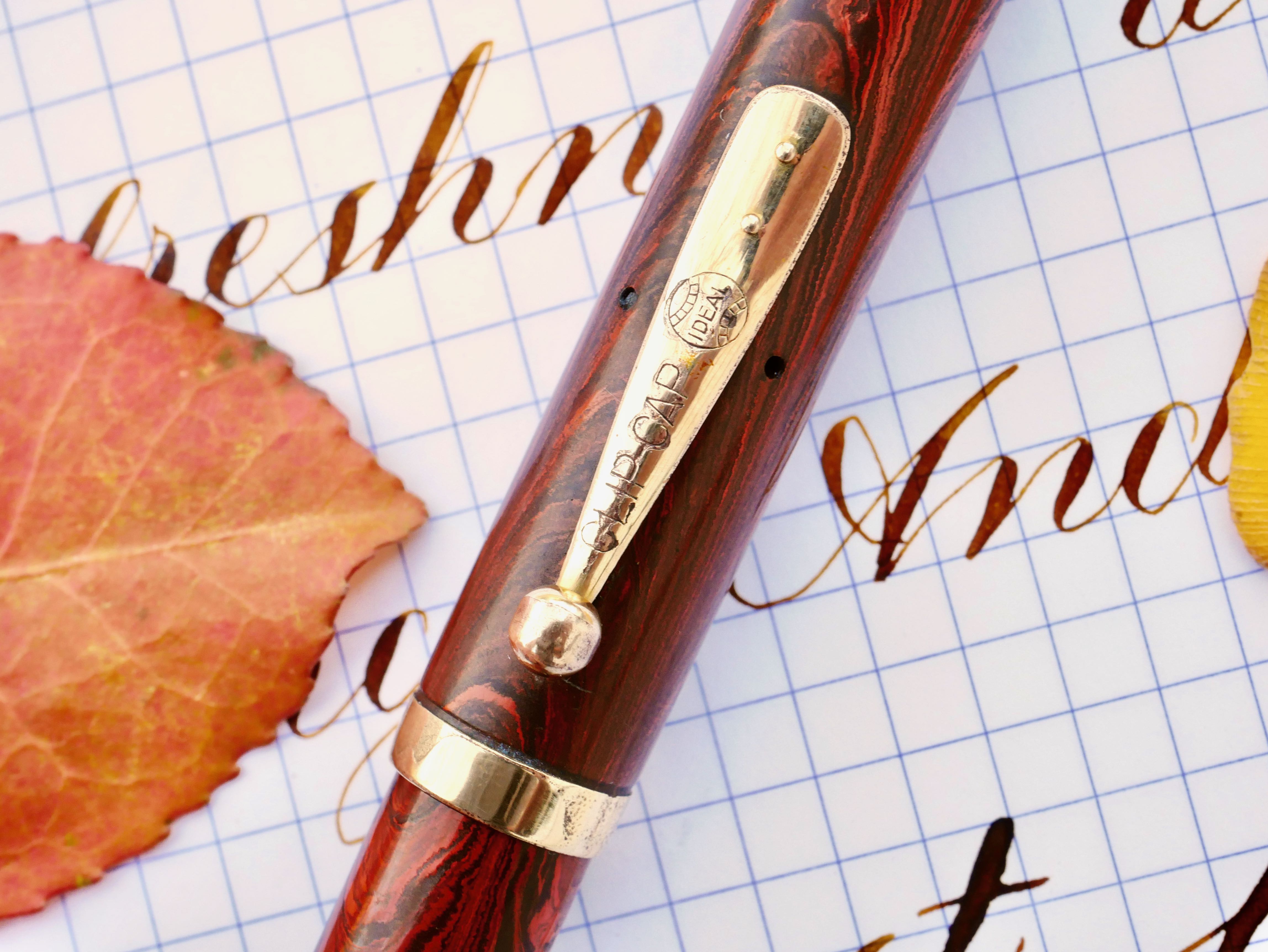 Here is the Parker Lucky Curve Jack Knife #20. These early Parkers are longer and more slender than the Duofold models and were titled as “Safety” pens since they had a screw on cap. This Jack Knife is made of hard rubber and still retains it’s dark, black color. Imprints are a little worn but still readable. The nickel clip has some wear to the edges but otherwise in good shape. The 14kt. Parker Lucky Curve nib has the tiniest crack coming out of the top of right curve of the heart-shaped breather hole (looking at it from a writing position). I almost missed it, it is so small. You can just barely make it out in the picture. I debated whether to send this off to get welded shut and decided that it just wasn’t cost effective (i.e. a lot of money for something that isn’t a great concern). This spot on the breather hole is the least concerning of all cracks, and this one is miniscule. I know cracks scare a lot of people, but they are quite common in flex nibs due to their thinner profile. I have a whole pile of cracked nibs, and have used some of them frequently for years. So long as you don’t over flex (something you shouldn’t do even if there isn’t a crack), the crack remains quite stable. So back to the nib….it’s wonderful, wet noodle soft nib. Normally, it writes as a wet F (0.4mm). It’s soft enough, however, that even slight pressure causes movement in the tines and so isn’t the most pleasant writer. The flex, though, is amazing. While the range isn’t massive (F to BB / 1.5mm), the responsiveness is approaching dip nib quality. It is really quite exceptional. It’s the kind of nib that you could easily add flex to your normal cursive writing without using hardly any extra pressure but also without having to worry about things getting too wet and blobby. The flex is just clean and crisp.