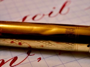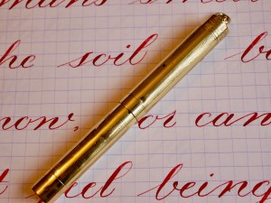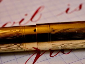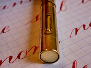 This is a standard size Skyline in a full gold-filled body. Overall, the condition is pretty good. The only spot of brassing I could see is a little on the edges of the lever from rubbing on the pen cap when it is posted. There is a decent sized ding on the body (see pic), and one very small ding on the cap. Often these pens are full of pin prick dings and scratches all over. The 14kt. Eversharp nib is beautiful, wet writer. Silky smooth and soft nib with lots of flow. It writes normally as a F/M (0.55mm). The flex comes quite easily with decent range going up to at least 1.5mm. For a near medium nib, the flex responds with surprising snappiness. The flow is more than enough to keep up, which isn’t surprising for a Skyline. Overall, great pen in a durable and beautiful metal body.