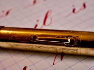 This is a standard size Skyline in a full gold-filled body. Overall, the condition is pretty good. The only spot of brassing I could see is a little on the edges of the lever from rubbing on the pen cap when it is posted. There is a decent sized ding on the body (see pic), and one very small ding on the cap. Often these pens are full of pin prick dings and scratches all over. The 14kt. Eversharp nib is beautiful, wet writer. Silky smooth and soft nib with lots of flow. It writes normally as a F/M (0.55mm). The flex comes quite easily with decent range going up to at least 1.5mm. For a near medium nib, the flex responds with surprising snappiness. The flow is more than enough to keep up, which isn’t surprising for a Skyline. Overall, great pen in a durable and beautiful metal body.