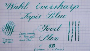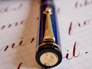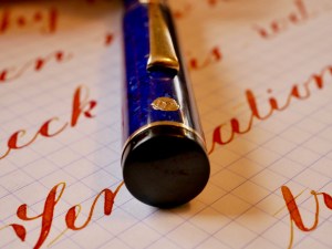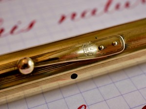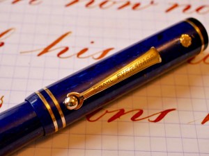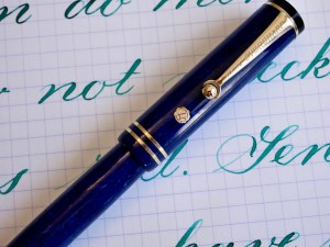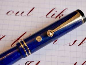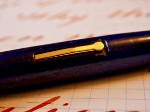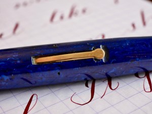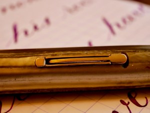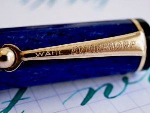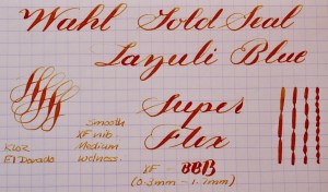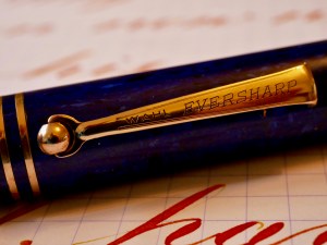 Here is the classic Skyline in the smaller Demi version. The body of the pen is in good condition with minimal wear from normal use. The gold-filled cap sleeve has some small dings here and there as is commonly seen with these. These sleeves are very durable, but they do end up showing the wear after using them for decades. The lever has lots a little bit of plating on it’s crown from where the cap gets posted. The 14kt. Eversharp nib is just a joyous XF. It writes an elegant, soft, and smooth line and then flexes up to BBB (1.7mm) with no flow issues at all. Ease of flex is a little on the firmer side of “super flex” as is usual with Skylines. Responsiveness is great. The KWZ Honey ink really shows it off in my opinion. A good Skyline with an outstanding nib.