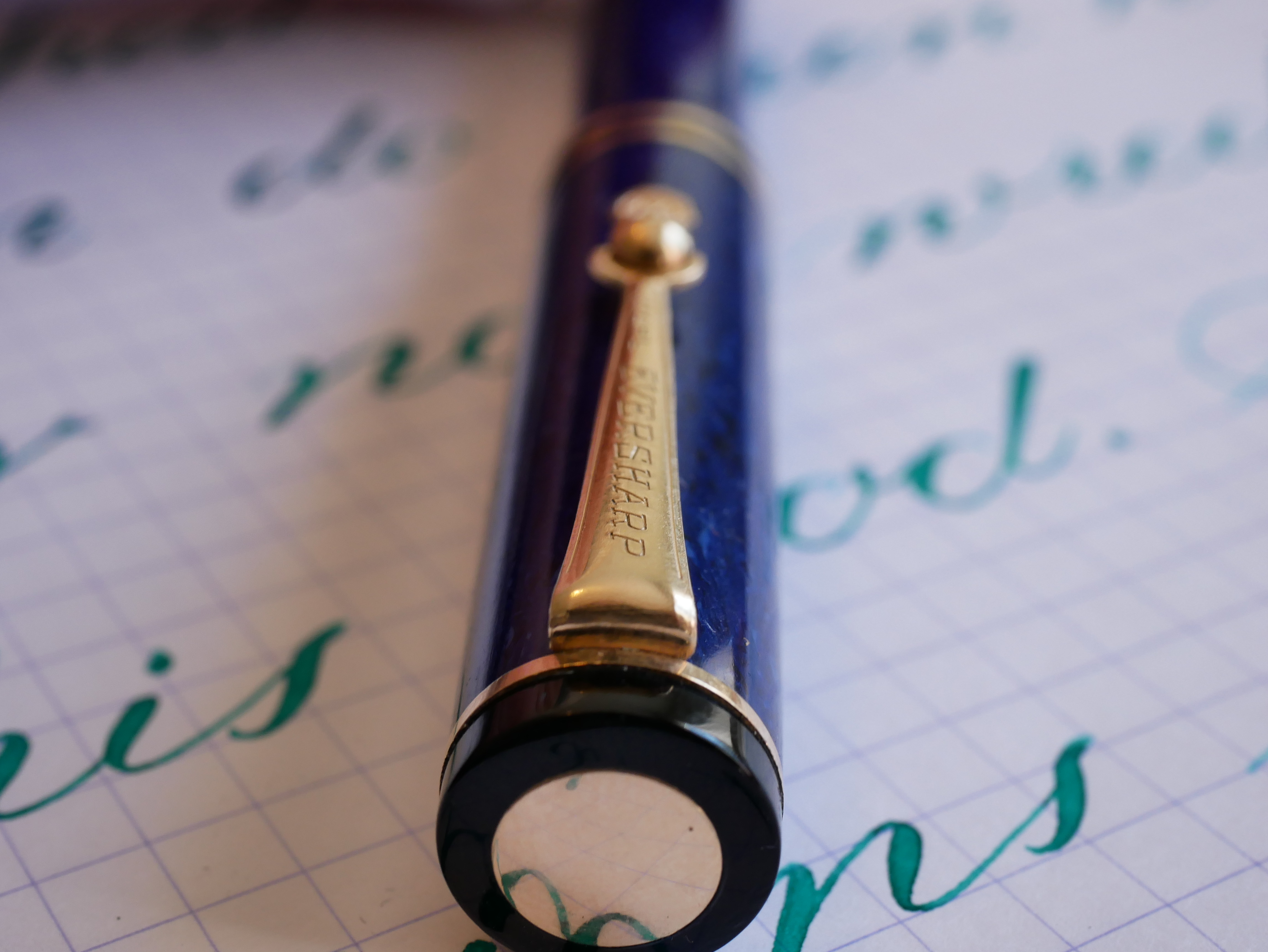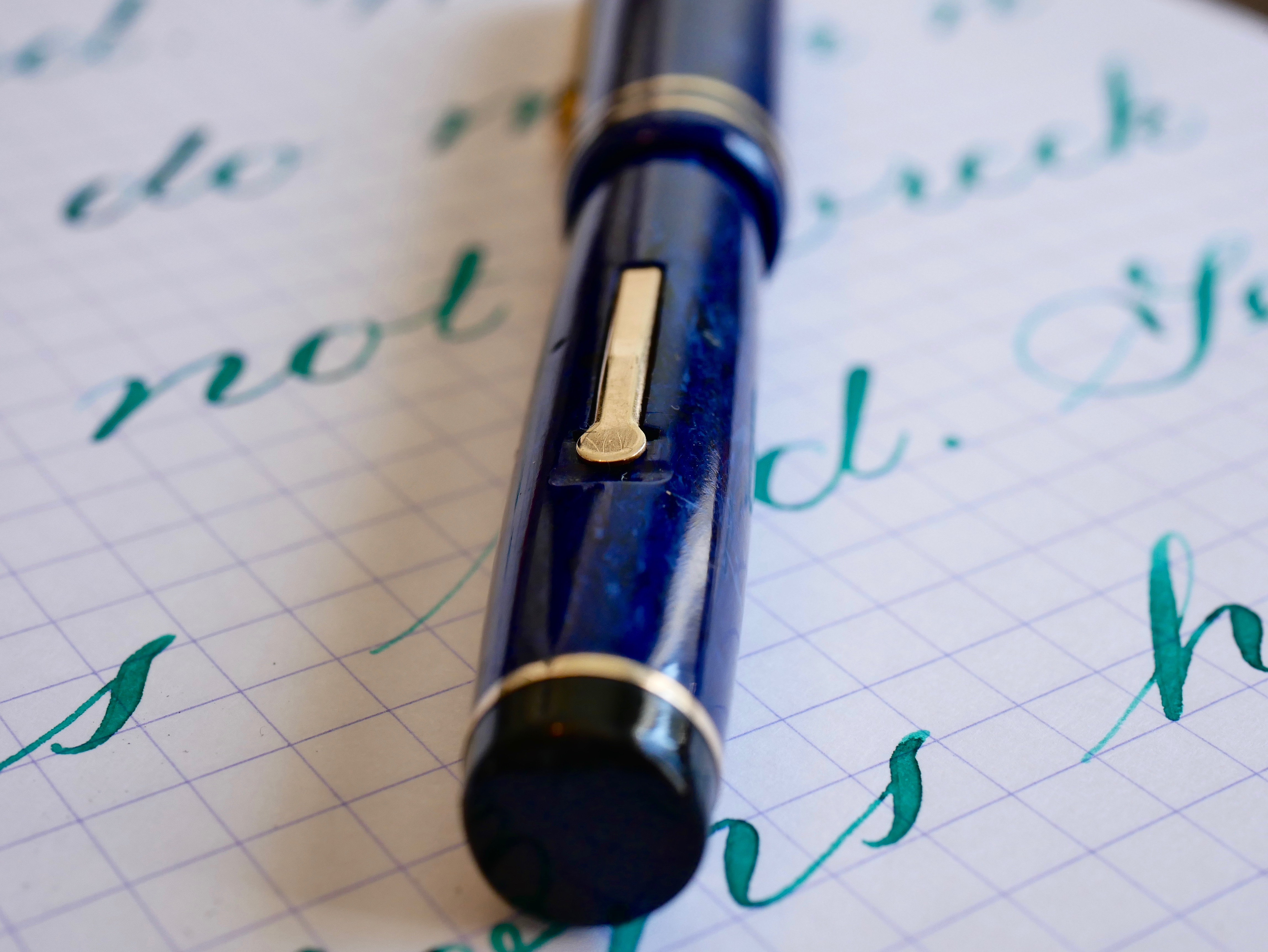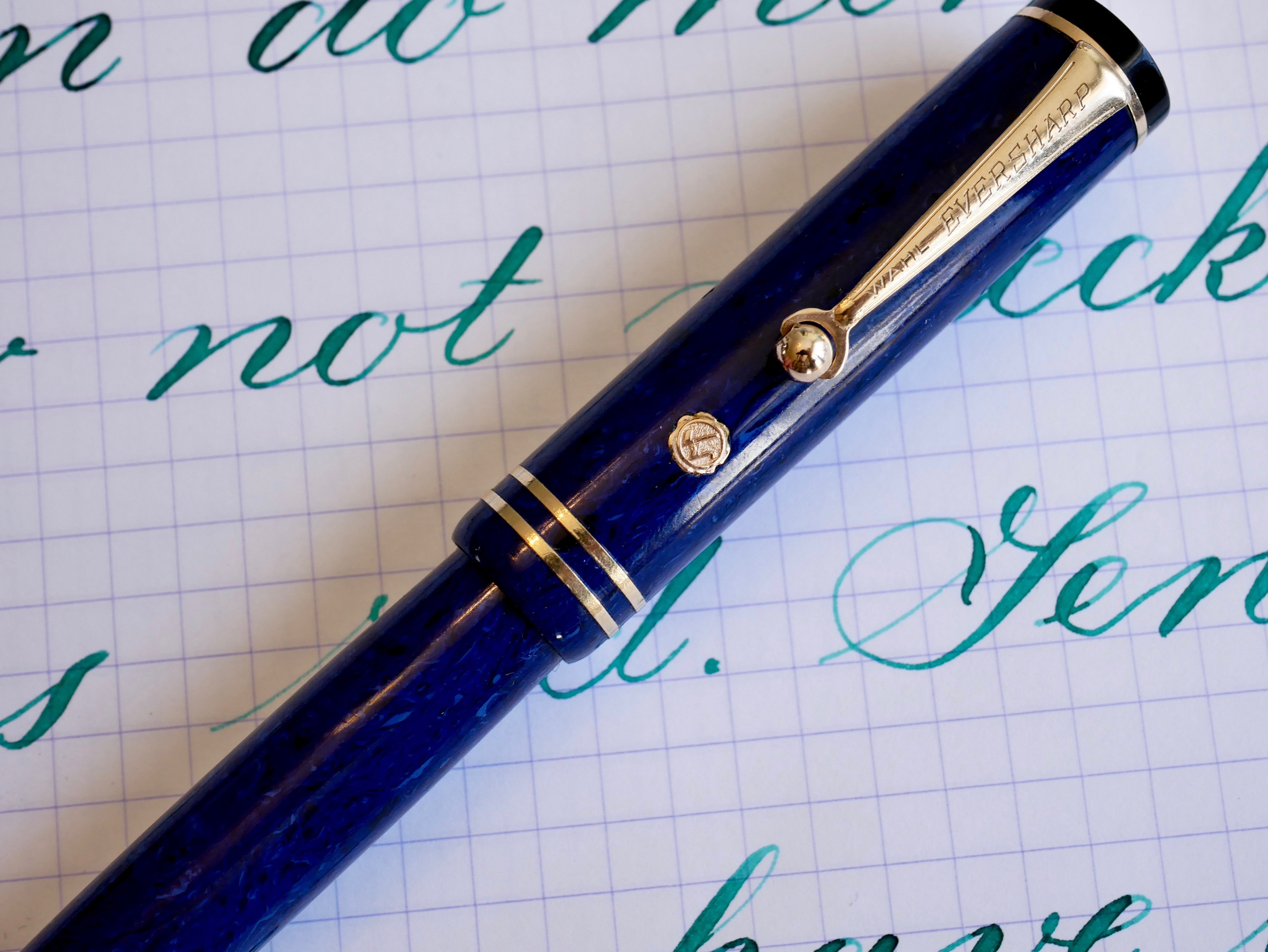 Here is the classic Skyline in the smaller Demi version. The body of the pen is in good condition with minimal wear from normal use. The gold-filled cap sleeve has some small dings here and there as is commonly seen with these. These sleeves are very durable, but they do end up showing the wear after using them for decades. The lever has lots a little bit of plating on it’s crown from where the cap gets posted. The 14kt. Eversharp nib is just a joyous XF. It writes an elegant, soft, and smooth line and then flexes up to BBB (1.7mm) with no flow issues at all. Ease of flex is a little on the firmer side of “super flex” as is usual with Skylines. Responsiveness is great. The KWZ Honey ink really shows it off in my opinion. A good Skyline with an outstanding nib.