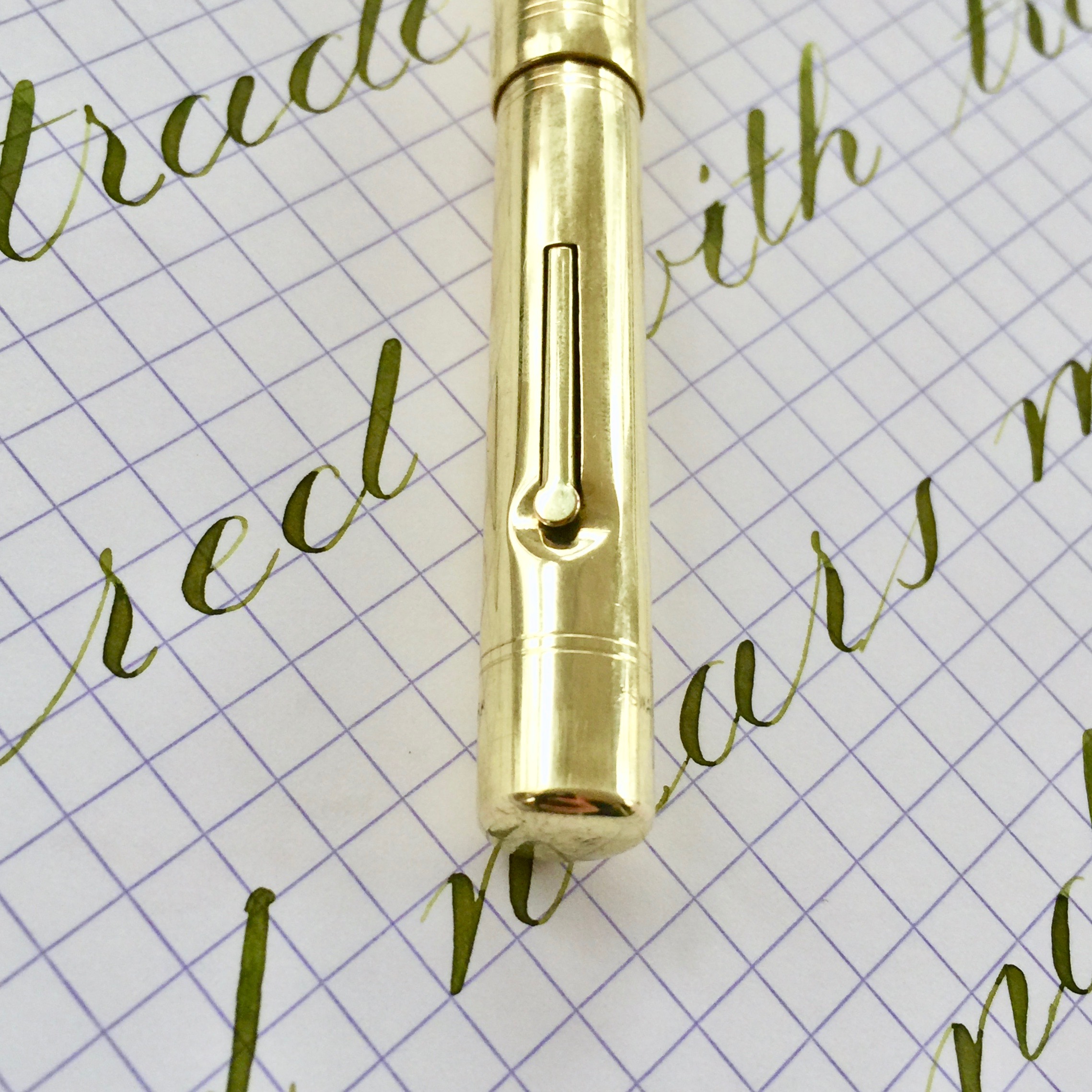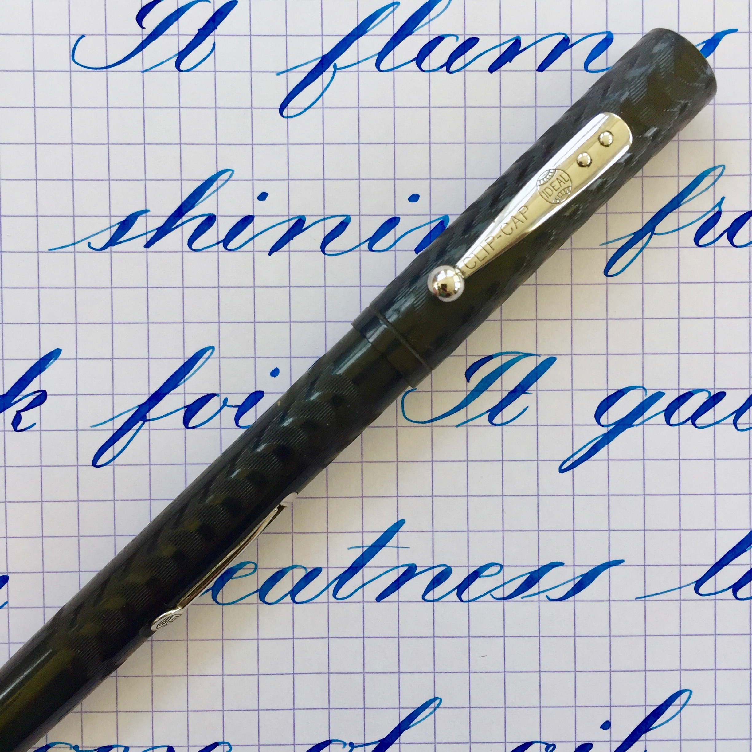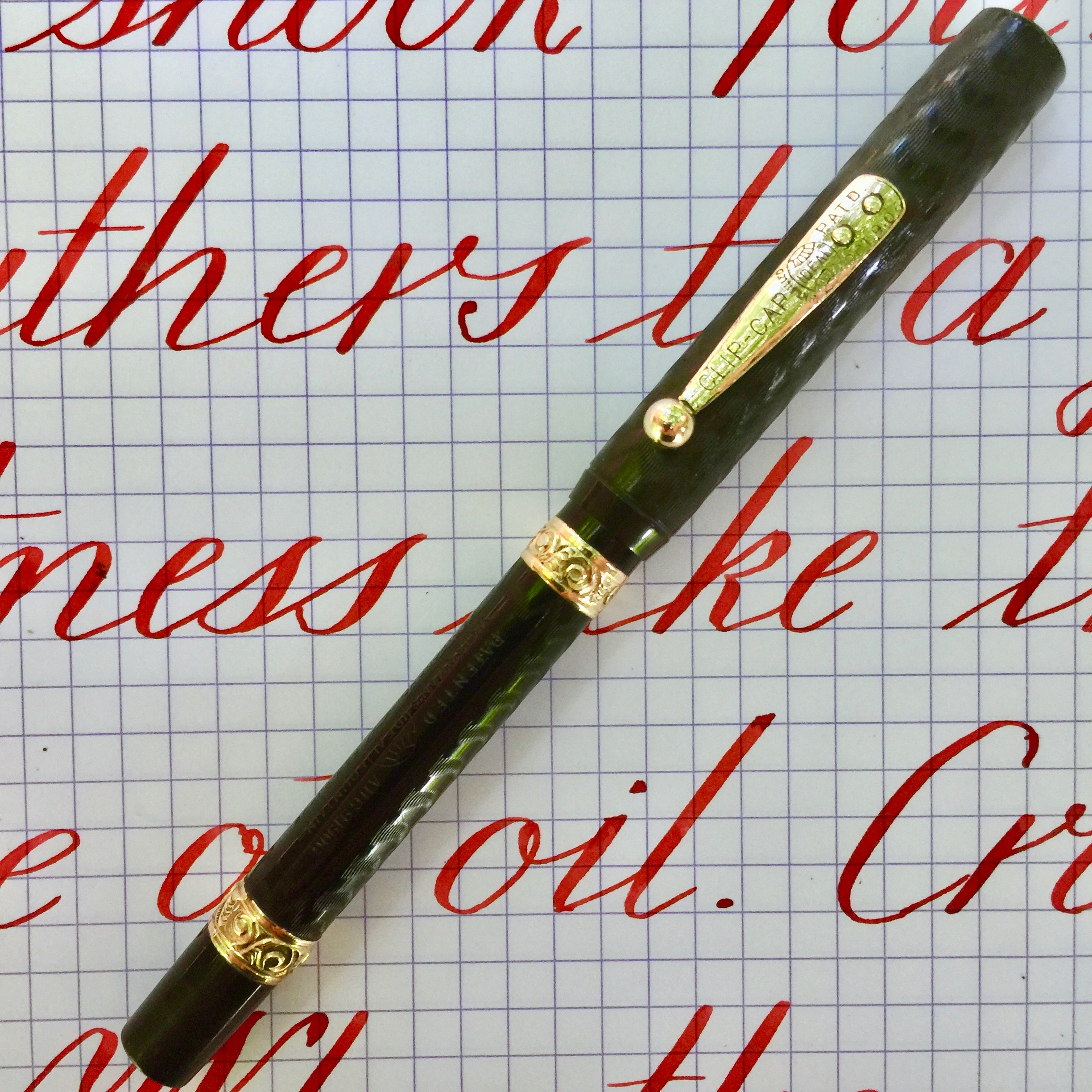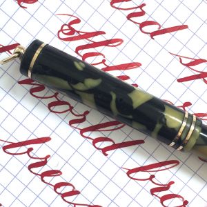 Here is a very special pen. It’s a fantastic Waterman Emerald Ray Ink Vue Pen with a New Old Stock Waterman Music Nib. The pen itself is in very good condition. It has great color. Very little scratching. Imprints are good, and just look at that barrel clarity! There is one spot of brassing on the edge of the clip. Actually, more of a nick than brassing. Also the very thin gold filled band on the top of the cap is partially missing (see pic), and the identical band on the bottom of the barrel is loose. Otherwise, the trim is in great condition. And then, of course, there is the nib. This nib by itself is worth several hundred. It’s in mint, never before used condition. It writes as a wet 0.9mm italic (that’s line width and not nib width). It has nice line variation. It’s more cursive italic than stub, I would say. Certainly not a crisp italic, though. It just glides across the page. It has a huge flex going up to BBBB (3.1mm). This pen uses a lot of ink very fast, so it really takes a good, lubby ink to take advantage of the full flex potential of this pen. I’ll send along a sample of such ink so you can hit the ground running. This may be your grail pen. SOLD