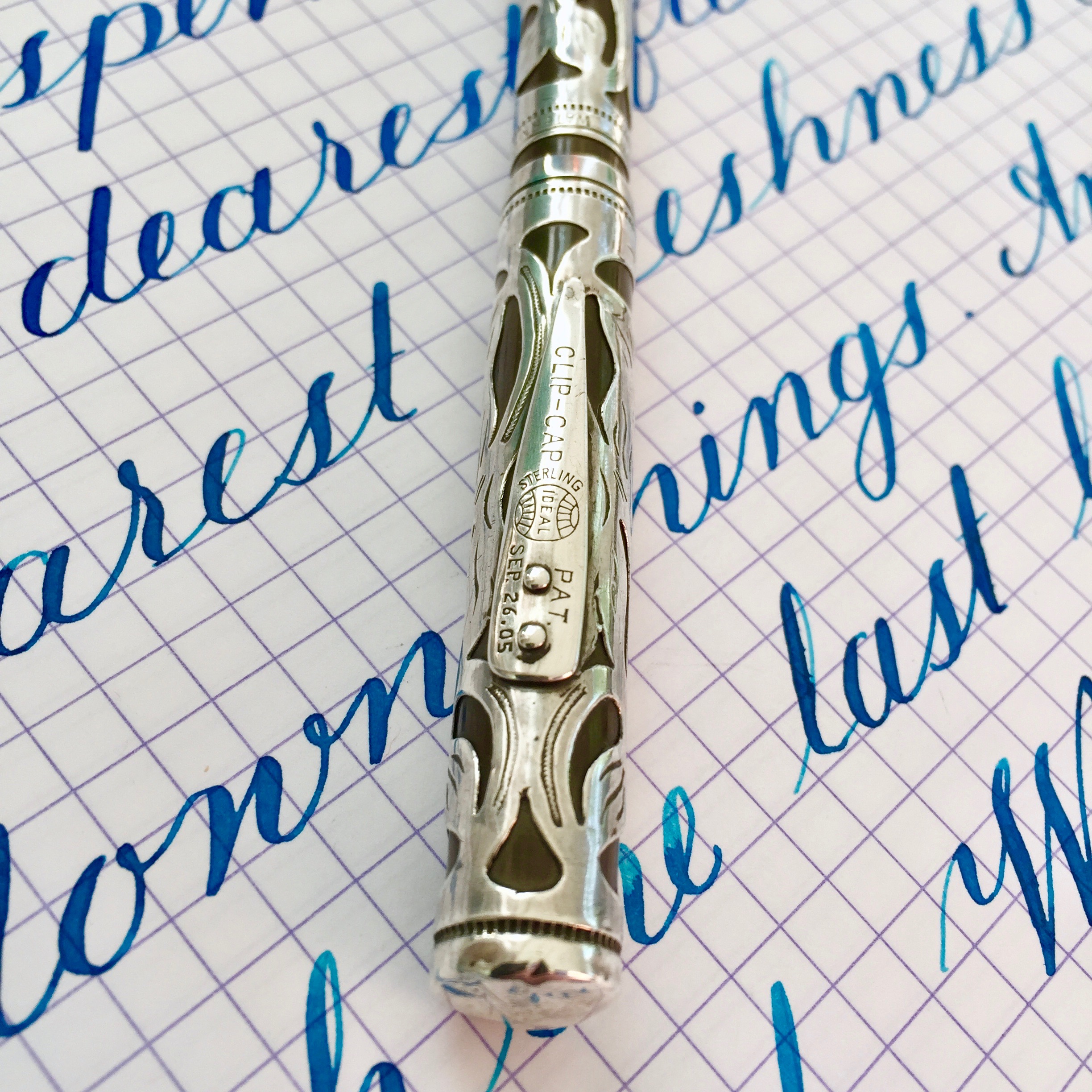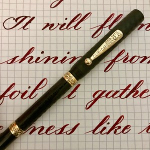 This pen is in near mint condition. The chasing shows almost signs of wear. The hart rubber has minimal browning. When I show this pen to non-fountain pen aficionados and ask them how old they think it is, I usually get a response like, “It looks pretty new to me.” I have done no polishing or blacking. It’s just nice. Plus the #2 nib is paint brush like with some massive flex lines going all the way up to at least 3.0mm. The nib also writes pretty nicely as regular Fine nib pen. I would say it’s between Fine and Medium.