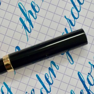 Here is a beautiful Wahl ring top in the stunning Lapis Lazuli blue. The pen is in great overall condition. The lapis blue is still very nice with little to no fading, and the black on the ends still looks new. There are some very light surface wear that you see with normal use, but you won’t notice it unless you look very close. The gold-filled trim is also in nice condition. There is only some very, very minor brassing on the edges of the lever. The 14kt. Eversharp “Flexible” #2 nib is a lovely soft nib that writes around a 0.25mm line, so between an XXF and an XF. The fine line makes flex work even more beautiful. Ease of flex is right in between “Super Flex” and “Wet Noodle,” so high end “Super Flex” or low end “Wet Noodle.” Range of flex goes from 0.25mm to 1.7mm, so there’s a lot of line to work with. Overall, a stunning Wahl Ring Top with top notch flex.