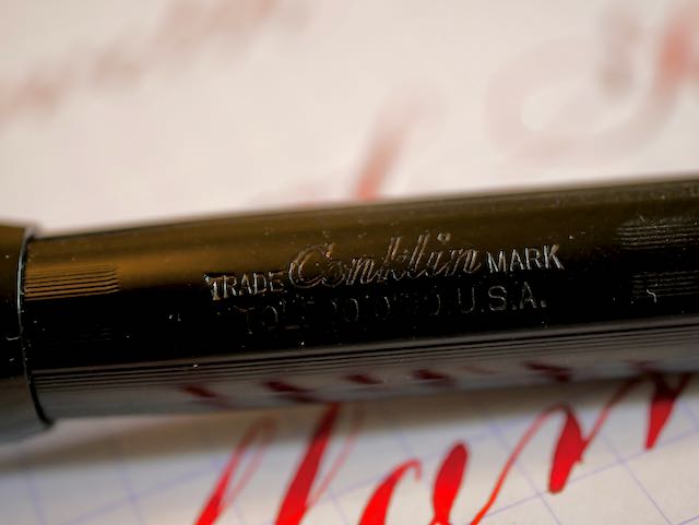 Here is a really nice vintage Conklin in a vest pen size. The pen is very similar to the Endura of the same size, but it is not marked Endura. It is in really great shape. The black hard rubber has almost no fading. The pin stripe chasing is still crisp as are the imprints. There is some small scratches here and there on the hard rubber body but they are very light and not very noticeable. The gold-filled trim also looks great. The made in Toledo Conklin #2 nib is a quality 14kt. gold beauty. It writes normally as a an XF. The flow keeps up perfectly but it is not the very wet flow typical of this era. It is smooth, not buttery, but smooth. It flexes nicely up to BBB (1.7mm) and has good responsiveness. Overall, a great little vintage pen.