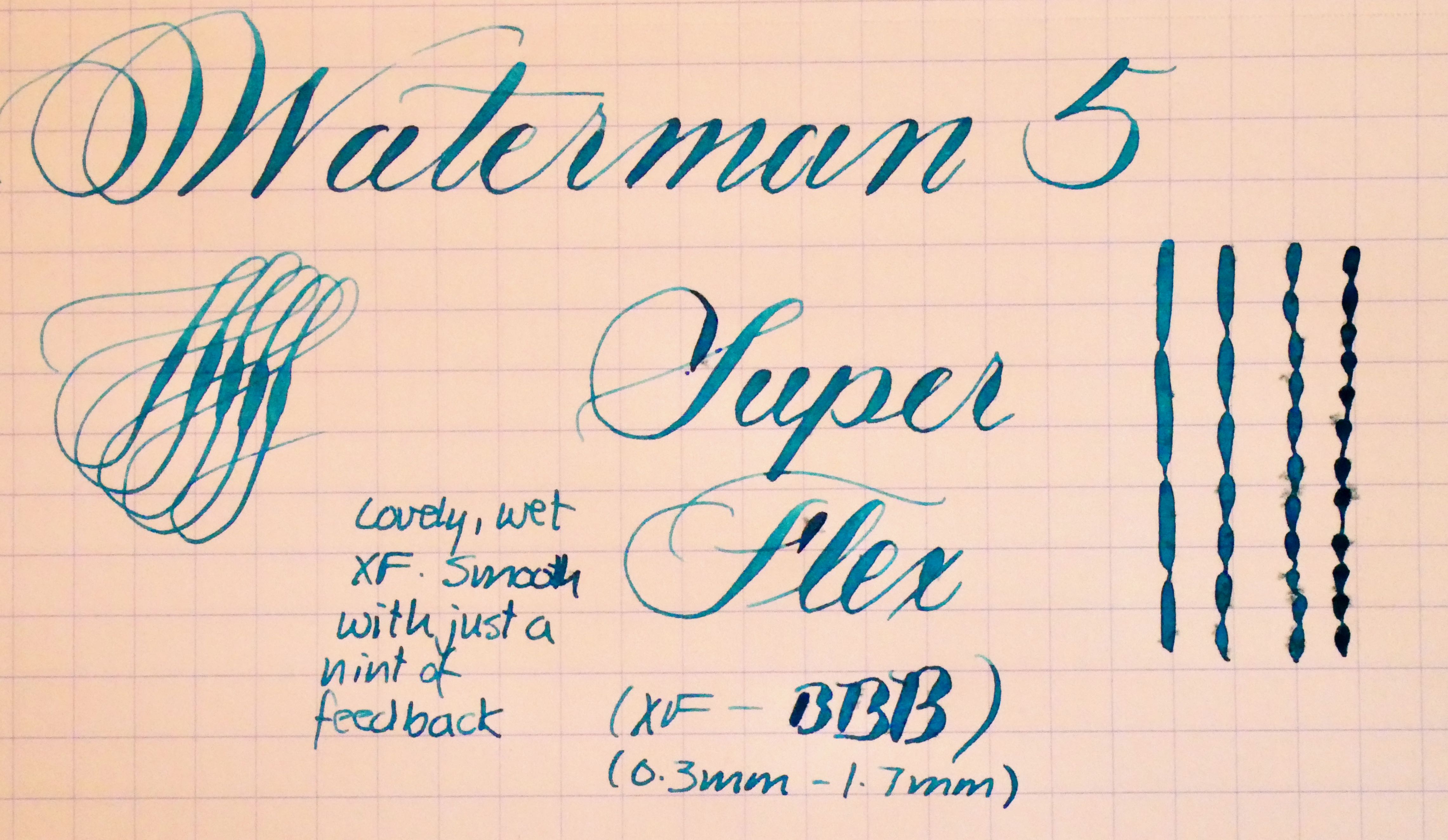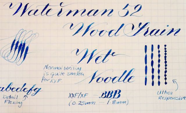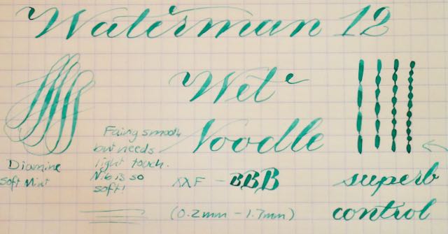 NIB: 14kt. Waterman #2, XXF to BBB (0.2mm-1.7mm), WET NOODLE (See “Grading Flex Nibs” for How I Grade)