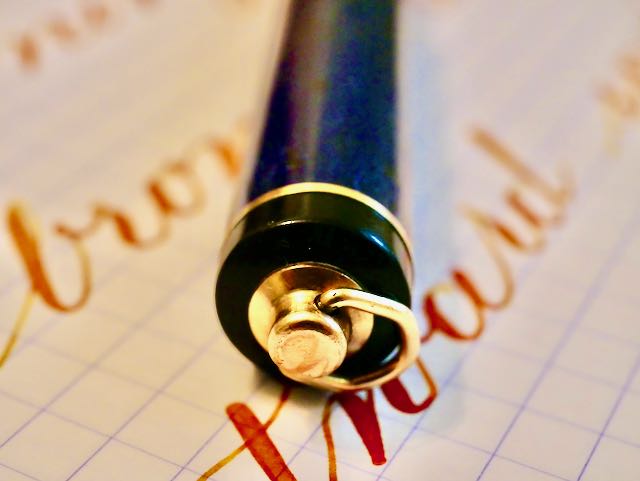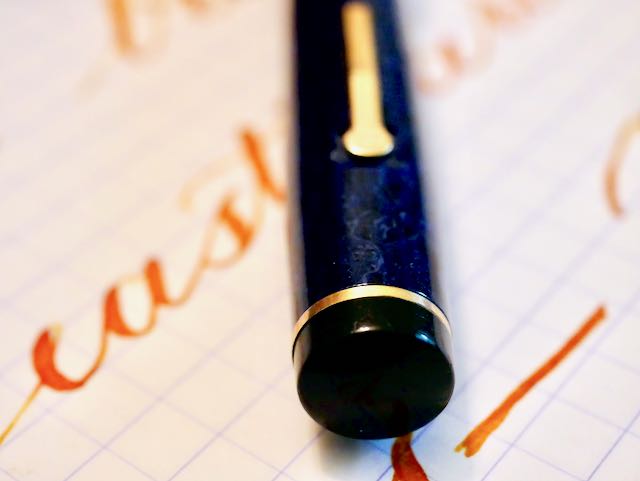 Here is a stunning Wahl-Eversharp Sapphire Ring Top. The pen is in overall beautiful condition. The gold-filled trim has minimal wear. Please remember that the pictures are ultra-zoomed and picking up flaws not detectable to the naked eye. The body still has great color, and only surface scratching typical of normal use. Additionally, this ring top is suited with a superbly soft 14kt. Wahl #3 nib. Normally, this nib writes as a XF / F (0.3mm-0.4mm). That is, with ultra light soft strokes, it’s a wet, glassy smooth XF. But add the slightest bit of pressure and the tines with split to a F. Often when tines are this soft they don’t make good normal writers, but this is soft and buttery regardless of the pressure you apply. The range of flex is wonderful going up to BBB+ (1.9mm!). The flow keeps up well, and the responsiveness is still quite good for a nib this soft. If you are looking for a pen in this size, I’m not sure what more you could ask for. It’s beautiful, superb craftsmanship, and equipped with a superior all around nib.