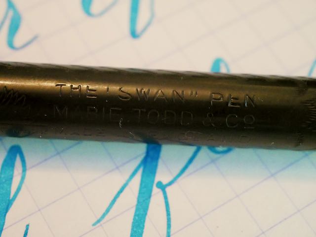 This is a made in England Mabie Todd Swan eye dropper with an ebonite over/ under feed and comes with a “Swan” metal pocket sleeve. The pocket sleeves allowed one the ability to bring along their eye dropper without having to worry about the cap slipping off. The pen itself is clearly well used. It’s faded to a dark brown and most of the imprints are worn off. This is a no frills Swan eyedropper. Just a plain black hard rubber body. The 14kt. #2 Swan nib is just amazing. There was a crack in it’s base that I had welded by Greg Minuskin. Normally, this nib writes as smooth and very soft XF (0.3mm). Flow is just about perfect, not too wet, not too dry. And the flex is sublime. This is near paintbrush soft but retains just enough resistance to allow for some phenomenal responsiveness. Many of these over/under eyedroppers just aren’t that usable for anything other than flex, but this one is a great writer and a great flex pen. Feed has no issues keeping up. An eyedropper means you can fill with plenty of ink. And the Swan metal pocket sleeve means you can take it with you.