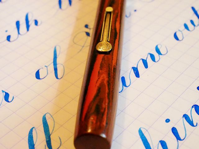 This is I believe the Wahl “Signature” pen which followed the Tempoint but preceded the gold seal and personal point models. This one comes in what Wahl called “Rosewood” hard rubber, very similar to Waterman’s wood grain hard rubber but generally a bit redder. The hard rubber has faded a little and lost it’s original sheen, but the color is still very good. The gold-filled roller clip is in very good condition with no brassing. The cap bands are also in good shape with just one tiny spot of brassing on one of the lower bands. The lever, however, does have some brassing along the edges. The 14kt. Wahl #2 is a beautifully soft wet noodle. What I would call near paint brush soft. Normally, the nib writes as a very wet XF. The tines require almost no pressure to start spreading, so it doesn’t provide a super smooth writing experience. Responsiveness is very good considering the nib’s softness and the range is excellent going from XF (0.3mm) to BB (1.5mm) with ease.