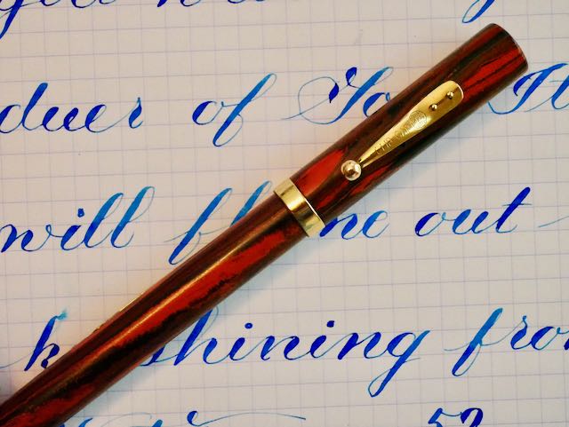 This Waterman 52 1/2 red ripple is in great overall condition. The red ripple hard rubber is only slightly faded and has good color overall. The imprints are also good and crisp. The gold-filled trim looks fantastic overall with just the slightest bit of brassing on part of the top edge of the cap band. Otherwise, there is only some slight scratching from use. The 14kt. Waterman #2 is a very interesting nib. It writes almost like an XF italic (0.4mm). The tipping is getting low, so this grind may not be original. Regardless, it is a lovely nib to use. With very light pressure it flexes easily enough for me to grade it as a wet noodle. The responsiveness is also very good and it ranges from 0.4mm to BB (1.5mm). There is just a tiny bit of a bend in the tines which I wasn’t able to pick up in the pics, and you can only see when the light hits it just right. It does not affect the nib’s performance, however.