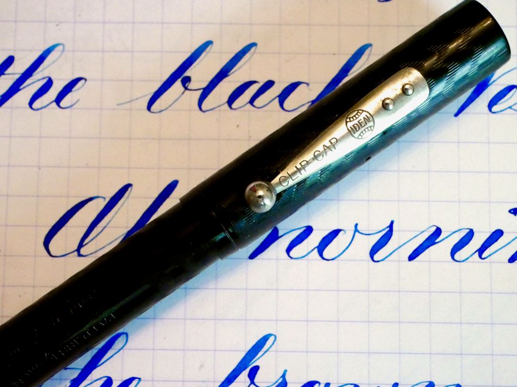 Here is Wahl-Eversharp Doric in a beautiful blue. What I think Wahl called “blue shell.” This is a vac-filling modeling comes with the rarer white gold trim. The body looks great with very minimal scratching. There is also no signs of any crazing or crystalizing of the celluloid. The clip looks great with no signs of plate loss. The band does have a little bit of brassing here and there. I replaced the plunger and rejuvenated (rather than replaced) the packing seal. Personally, I agree with the pen restorers who see no need to replace the seal if they original can be rejuvenated. I also had to put in a replacement pin at the top of the section as the original was missing. There is also a small chip out of the top of the section threads inside the barrel. This blemish has no effect on functionality and is completely hidden inside the barrel. The pen fills extremely well. Something to note, this cap does not post. Or at least it posts very, very loosely, but I find it more than comfortable unposted. The 14kt. Eversharp “Flexible” nib is a wonderfully springy and smooth writing XF. For reasons I cannot determine, when the pen sits unused for a few hours or so it needs a second to start writing. Once it starts, it never runs dry. It reminds me of some modern Platinum pens in that regard. The flex is fantastic. This isn’t a paintbrush soft, but it is wonderfully easy to flex and has a superb springy action. The feed has no trouble keeping up and the range is outstanding going from XF (0.3mm) to BBB (1.7mm). Dorics were made to be top of the line pens, and this pen definitely exemplifies that quality.