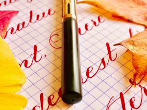 This Waterman 52 comes in the red mottled or wood grain hard rubber. The color is still very nice on this pen with only minimal fading. The gold-filled trim still looks very nice. You can obviously see it has some wear in the zoomed up pictures, but it is all much less obvious to the naked eye. Imprints on the red/black hard rubber models are really difficult to read, and this one still has imprints that definitely have some fading but in the right light and with good eyesight you can still read them. Only the globe in the center is mostly worn off. There are some very, very light teeth marks on the top of the cap. Honestly, I didn’t even see them until I noticed them in the picture. The 14kt. Waterman #2 on this pen is a gem. Many people define “wet noodle” in terms of quantity of flex (it goes BBBB++++) or ease of flex (paintbrush like), but I grade flex on quality of flex. So though this nib is very soft, it’s not uber soft. It’s something much better. It is ultra responsive, approaching dip nib kind of responsiveness. Just look at that crisp flex action in the pictures. Normally, this pen writes as a nice and smooth XXF/XF (0.25mm). It’s not glass, but you don’t expect that from an XXF. Range of flex is great going up to BBB (1.8mm with ease). The flow keeps up well, but that snap back is just spectacular. Notice the detail flex lettering done within a 5mm space! This 52 is in a beautiful, classic style. In good condition with good color, and a superb nib.